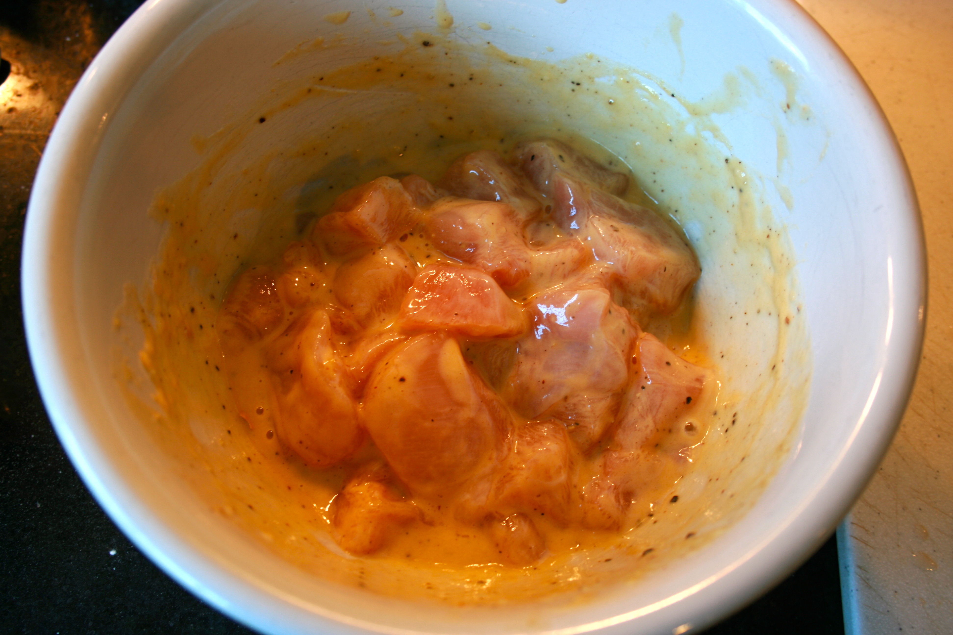 After gathering my ingredients, I whipped up the marinade. The recipe said ideally 12 hours- I only have about five- so hopefully it will work. Some flour, egg, soy, sherry- pop it in a bowl with my cubed chicken. Marinate away.