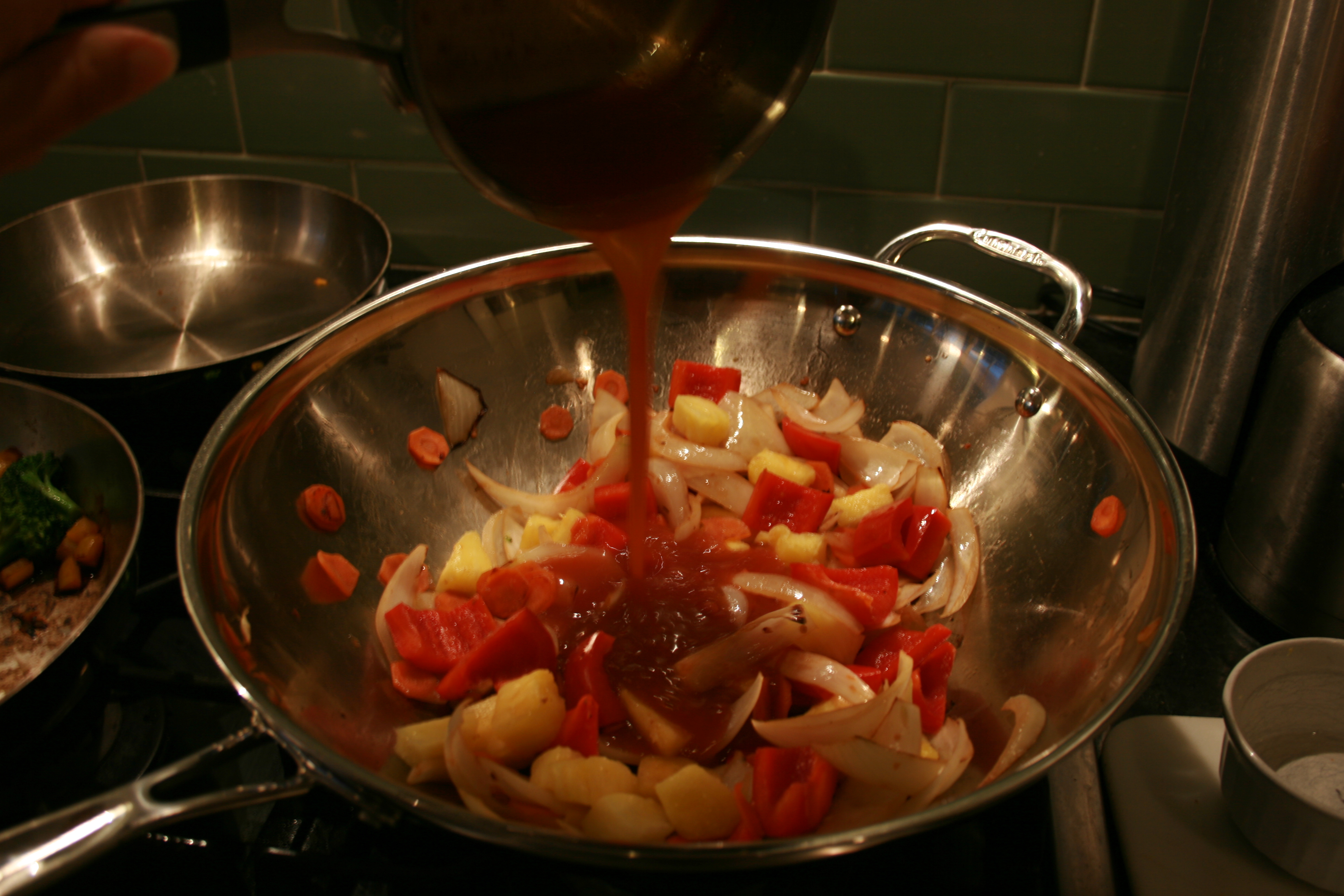 Mason is still eating and my light is still good, so lets make the sauce now too. I think it will keep in the fridge until dinner. This is just water, ketchup, vinegar, corn starch, soy, and sugar. Sounds sort of gross when it’s listed like that… just bring to a boil and keep on stirring. Two minutes. I think I need a nap.