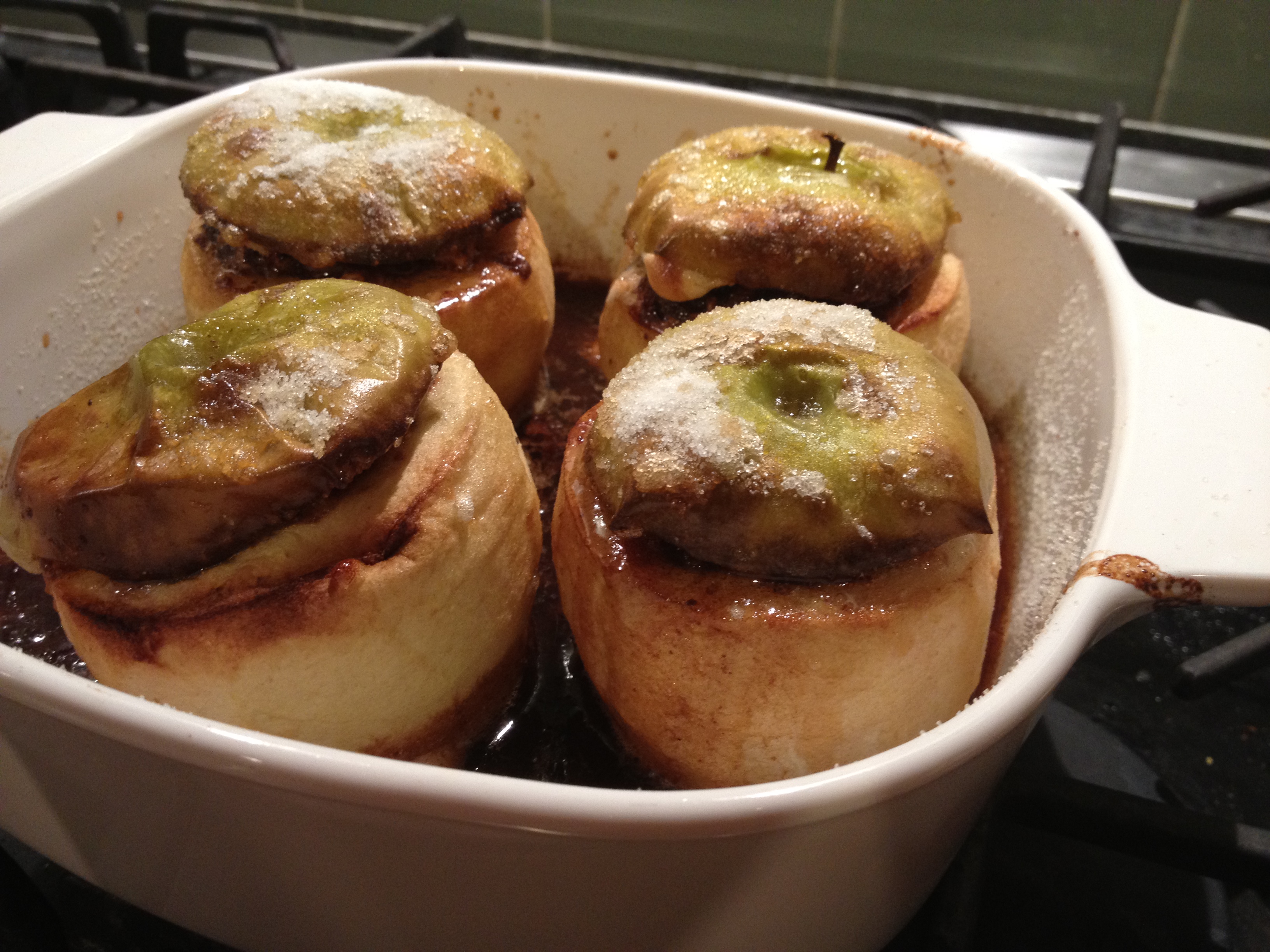 These were actually quite easy- peel an apple and hollow it out with a melon baller. Fill with roasted hazelnuts, dark chocolate shavings and a touch of lemon zest and butter-