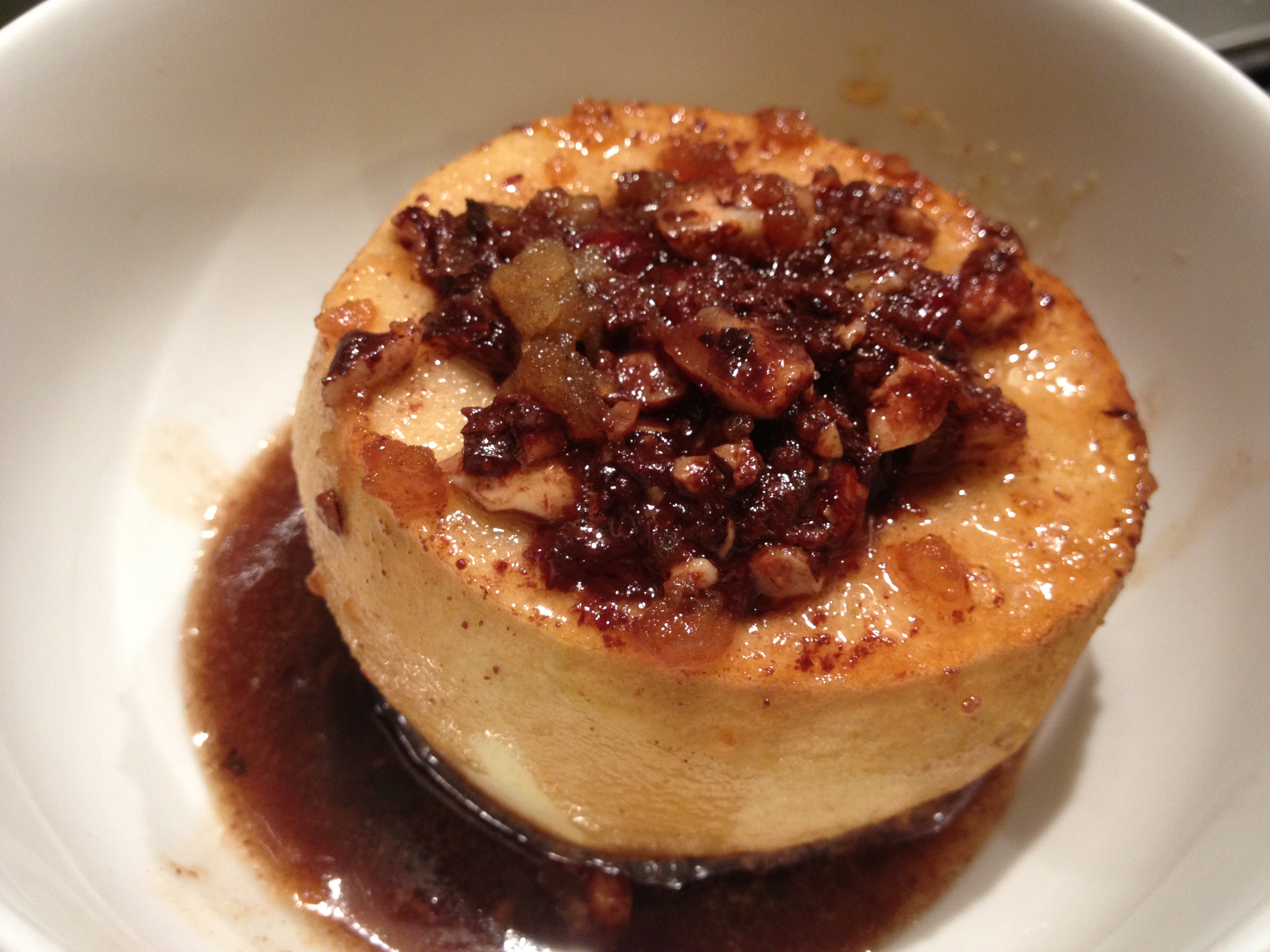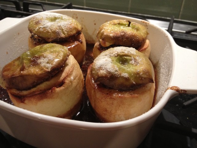 From Cooking with Italian Grandmothers, I made these Roasted Apples with Hazelnut, Bitter Chocolate and Lemon Zest. That counts as a fruit… right?