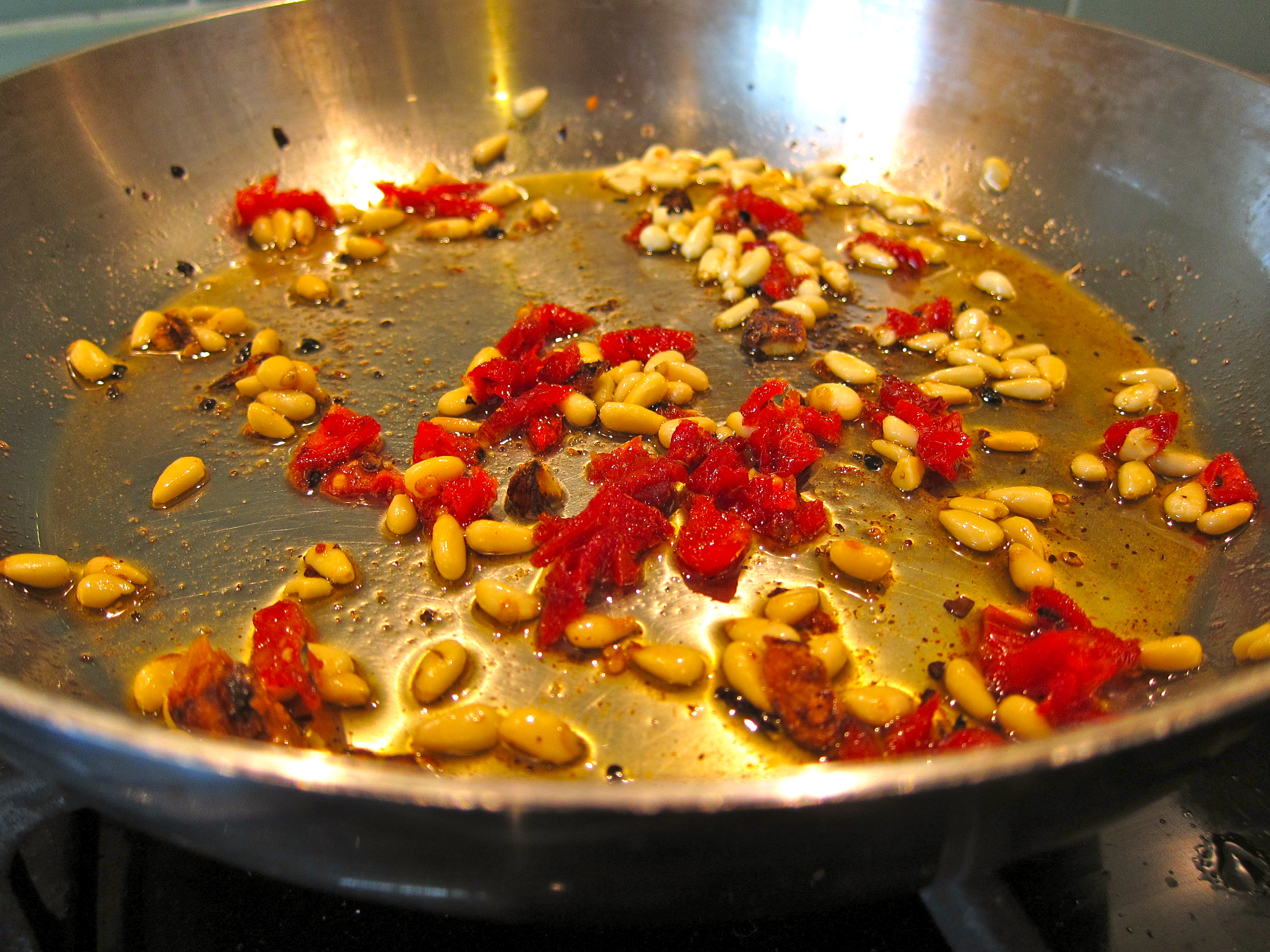 After the garlic is golden brown, add three finely chopped sun dried tomatoes. In the future, I might add more of these because they are so good… but again, trying to be a good girl today- so just three. Also two tablespoons of pine nuts.