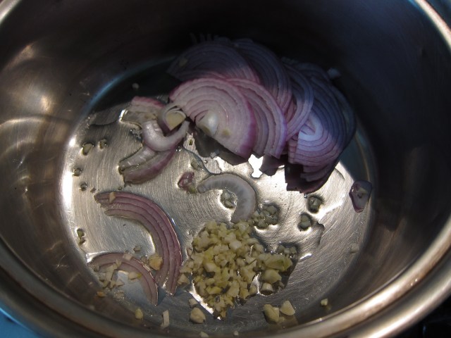 Just sauté a few cloves of garlic and half a red onion in some olive oil.