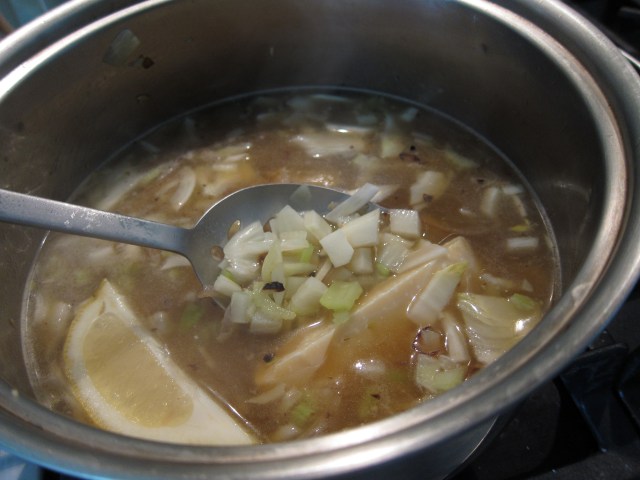 Also add a quarter of a lemon, four cups chicken stock and a touch of stock.  She also says that if you have a parmesan rind, throw that in.  Thankfully I’ve been binge cheese eating, so I had a rind at the ready.