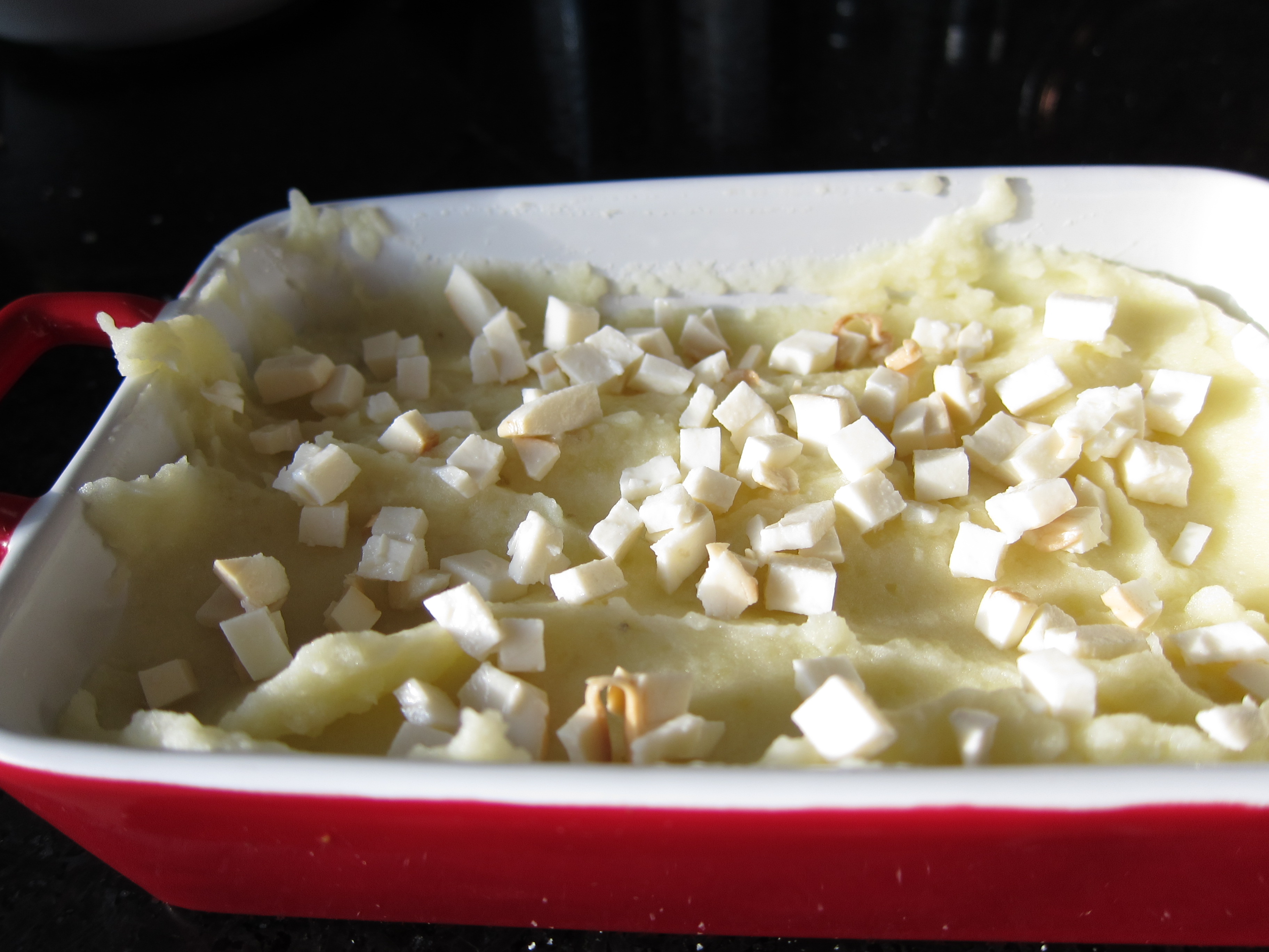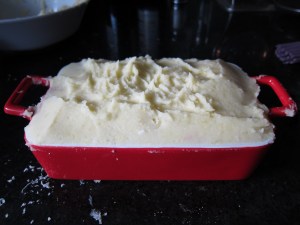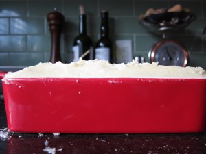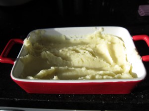 I repeat the layers, and it’s level. I now have to add one more layer of potato. I think I’m in the clear because mashed potato will hold it’s form, so even though it is now rising higher than the dish, I’m feeling confident…