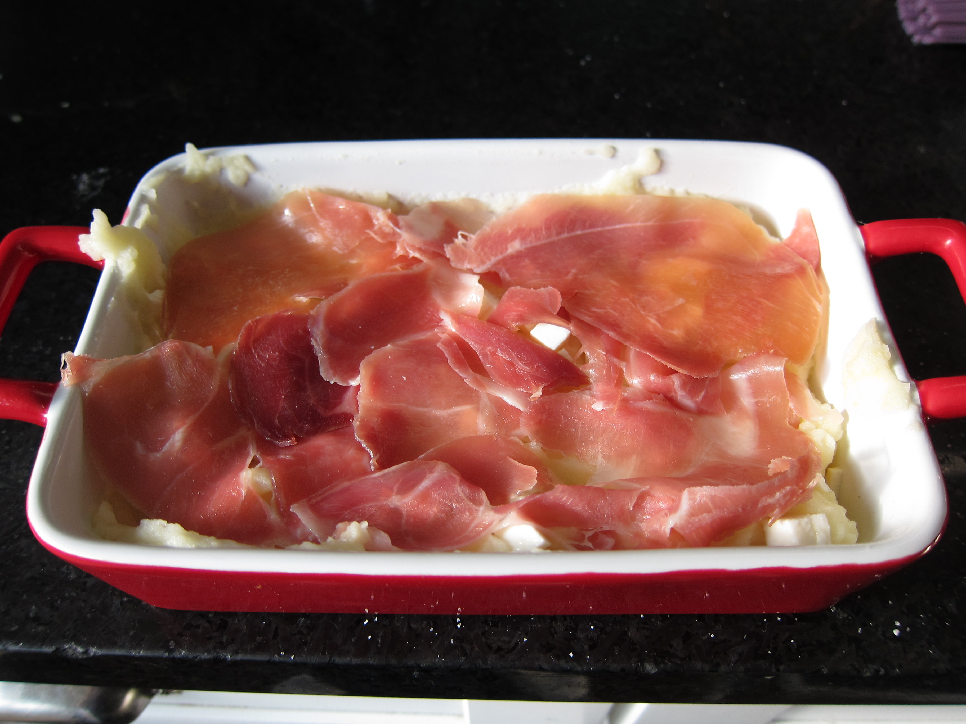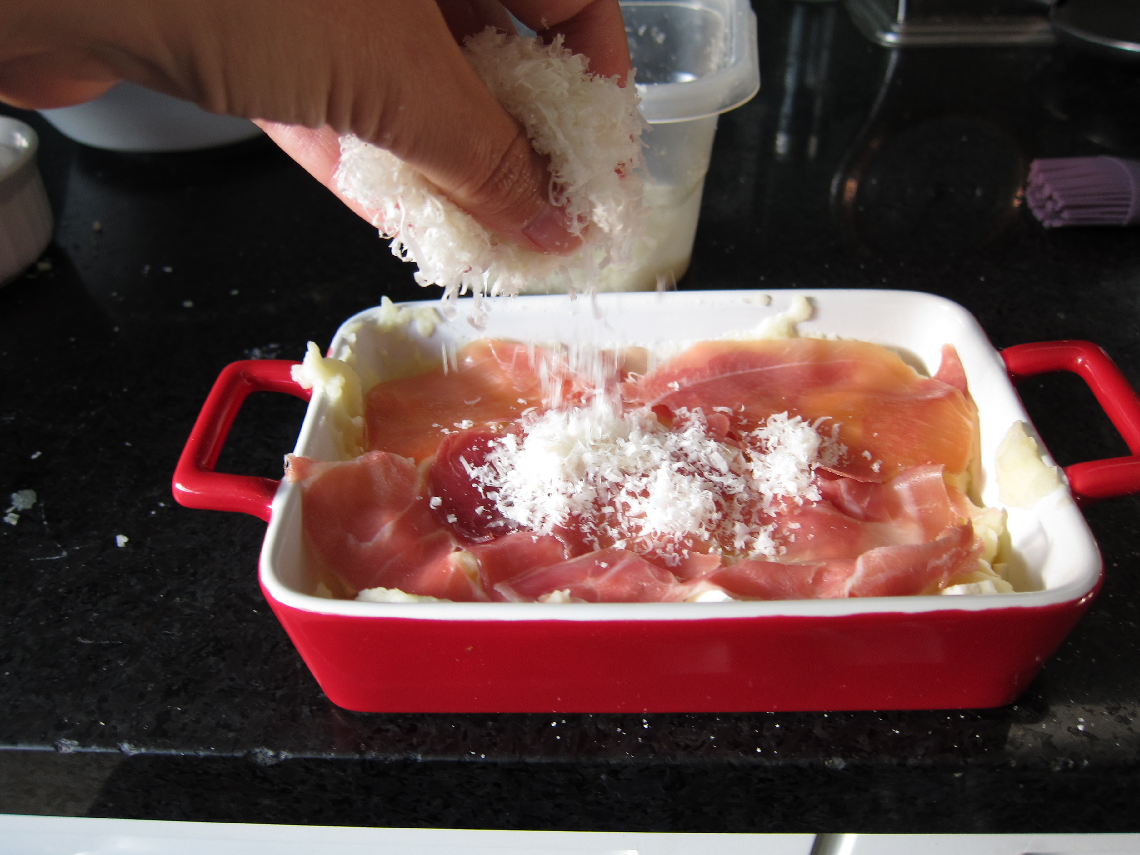 Follow that with a single layer of Prosciutto and a generous sprinkle of parmesan. Don’t mind my over-large hand. Remember this dish is small. Ahem.
