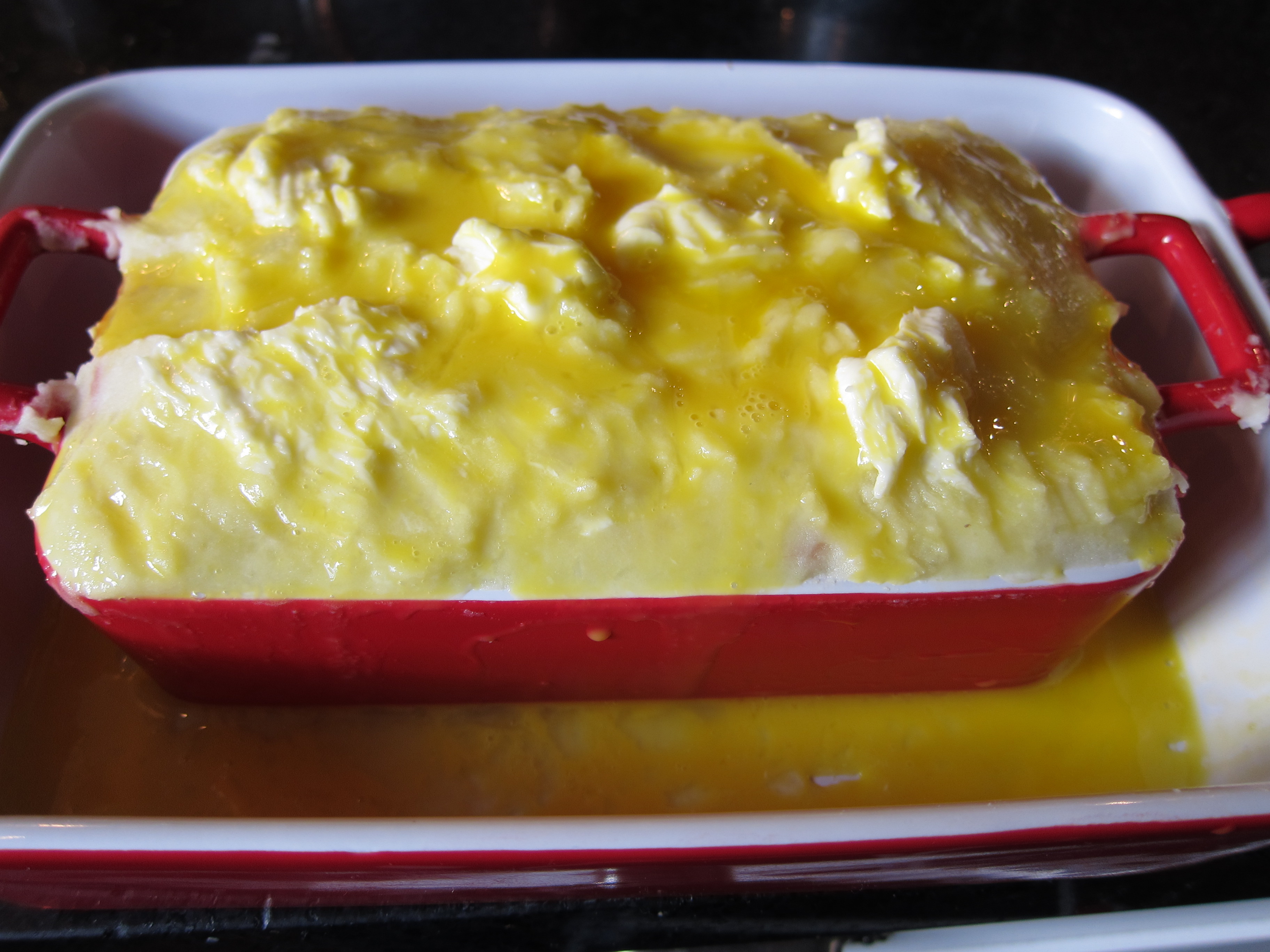 This is where it starts to get hairy. You’re supposed to butter a 9×13 pan and spread an inch of the potato mixture on the bottom. because I cut this recipe in thirds, I had to choose a substantially smaller pan. I did some quick math, and the area of the pan was the same.