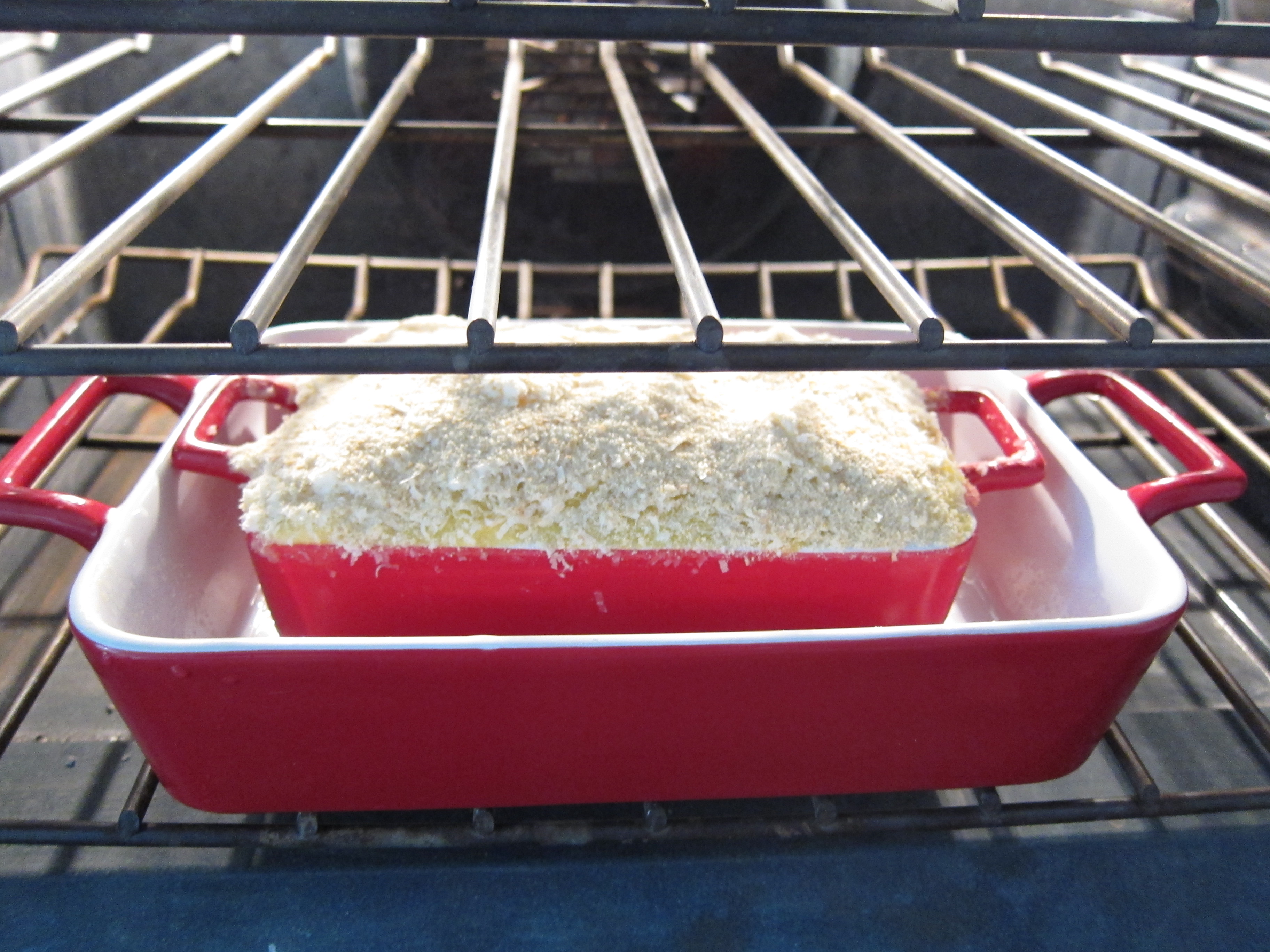 …and then crap. I realize I’m supposed to pour an egg with the additional yolk on top….Followed by breadcrumbs and more parmesan. Too late to go back and start over because the layers would be messed up. If I were on Project Runway, Tim Gunn would be telling me to make it work… so I’m going to.