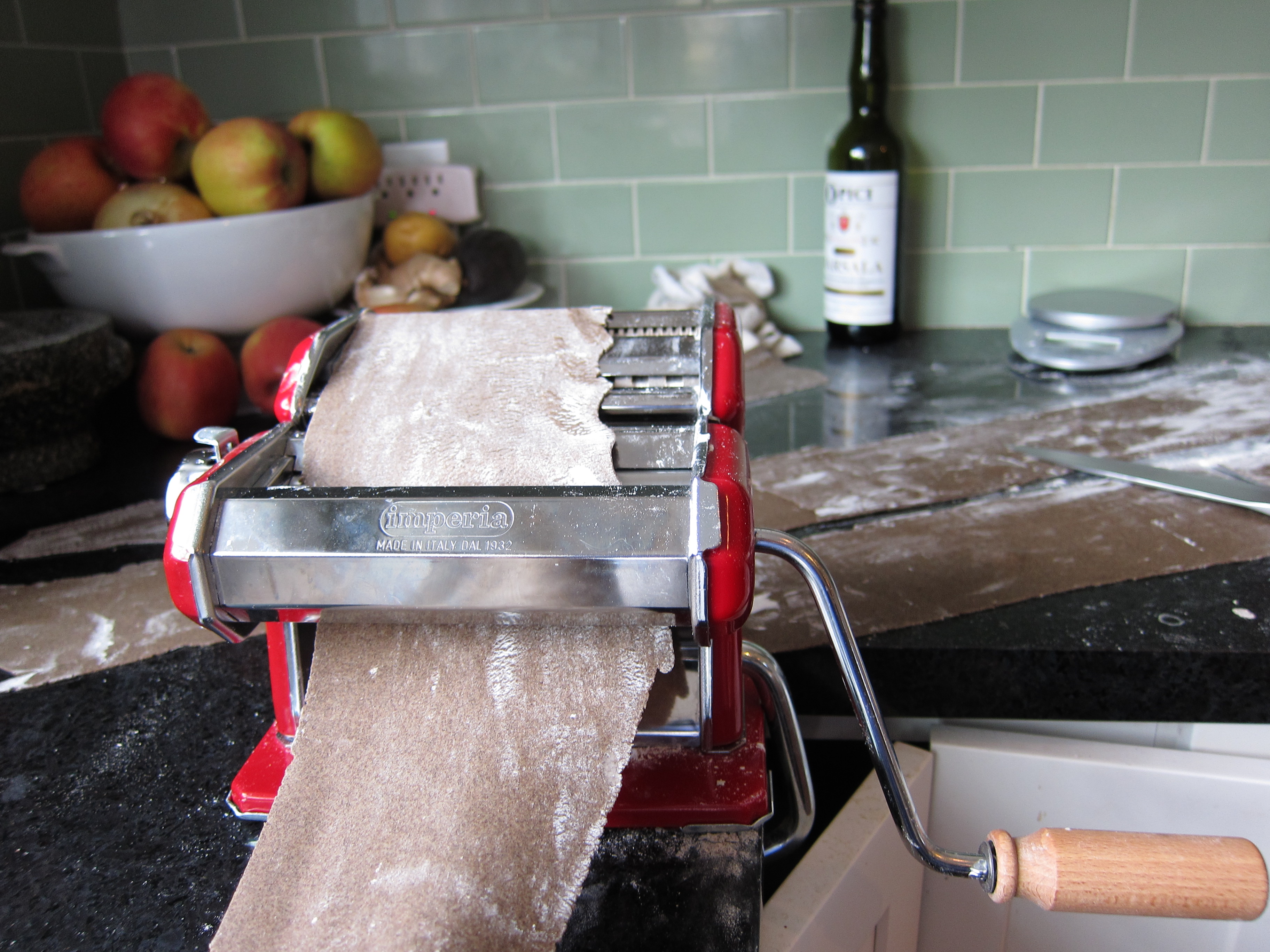 After it rests for about a half an hour you can run it through your pasta machine and cut it into strips 3 inches long and 3/4 inches wide (approx.)