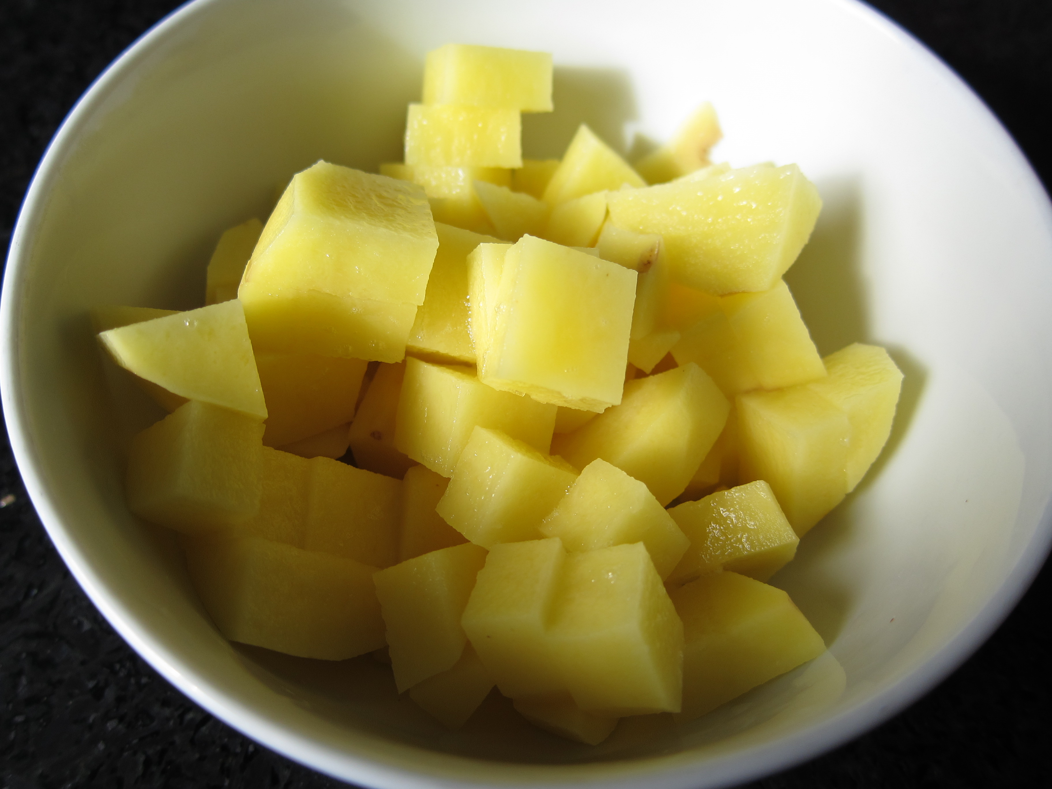 Boil some peeled some 1/2 inch Yukon Potatoes cubes for about seven minutes.