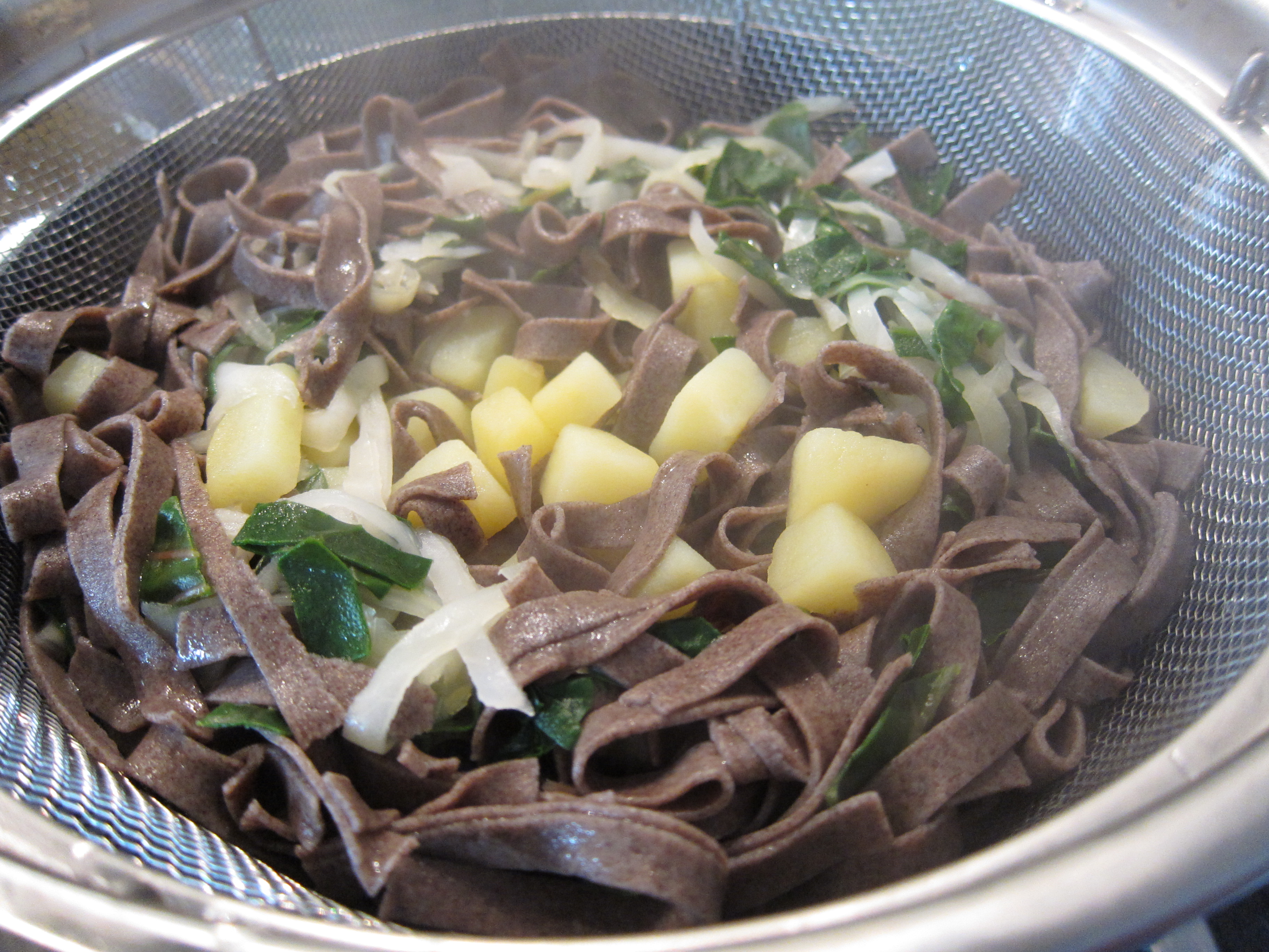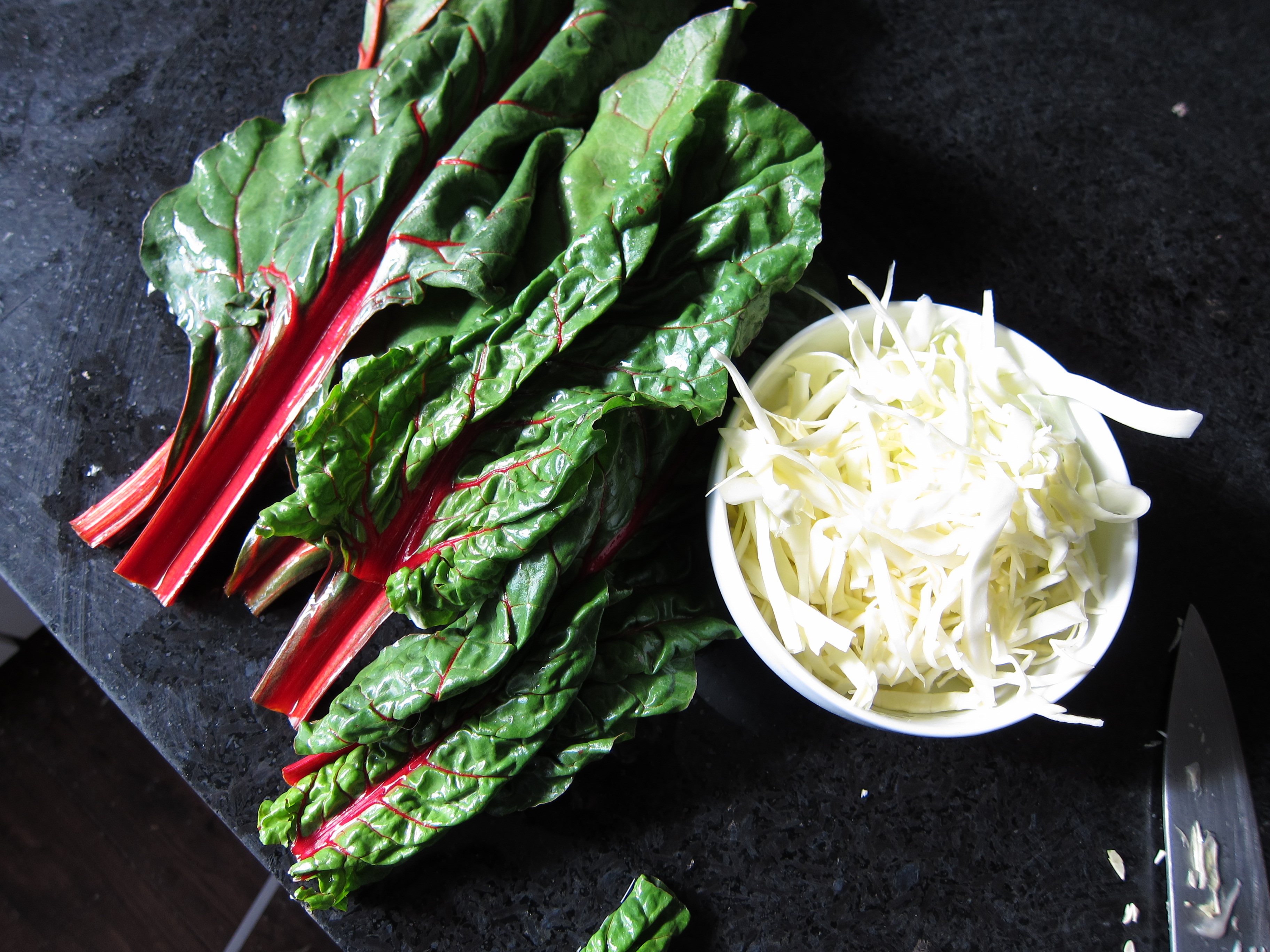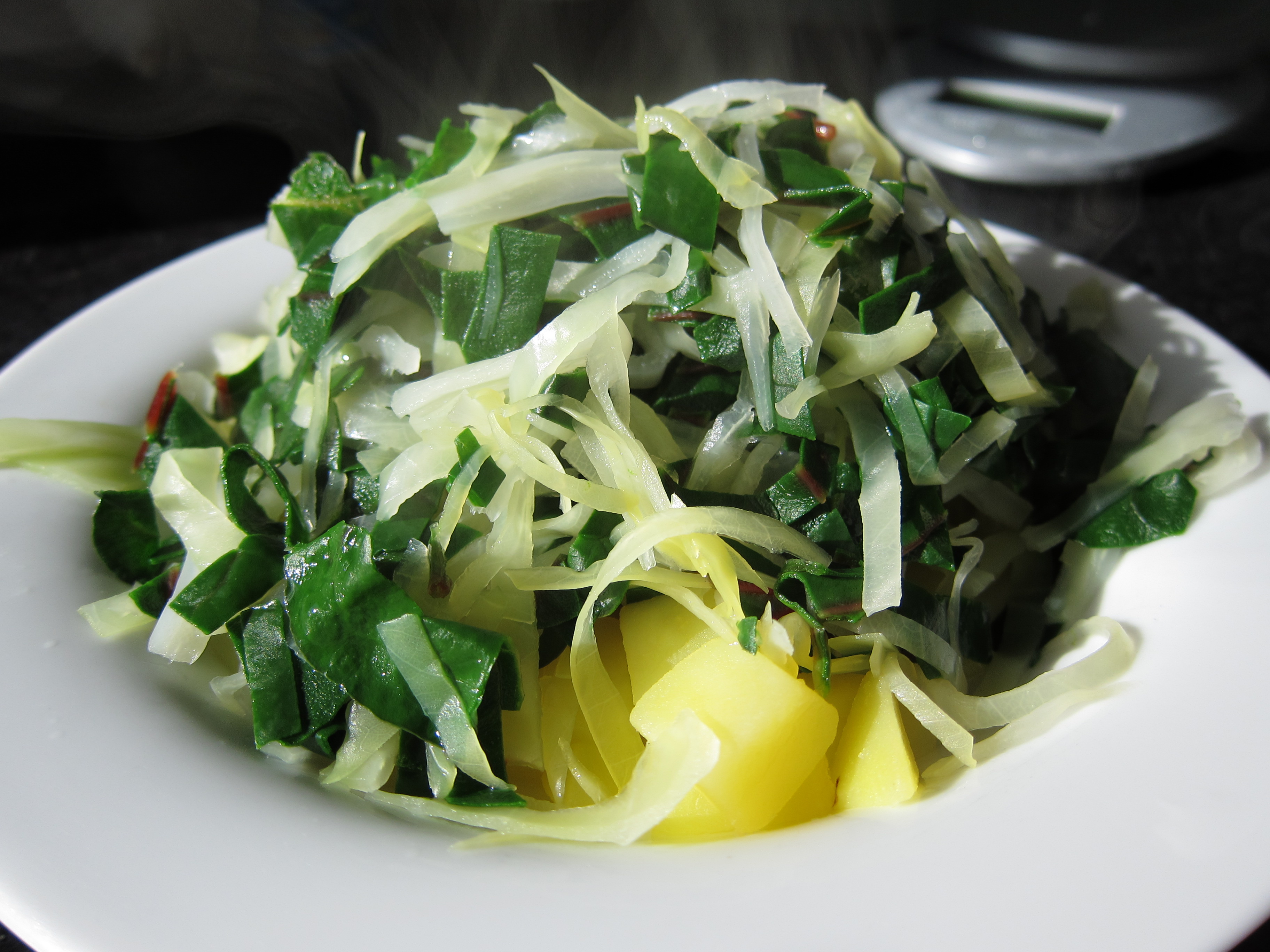 In the same water, blanch some cabbage and swiss chard for about two minutes. Remove with a slotted spoon and set aside with the potatoes.