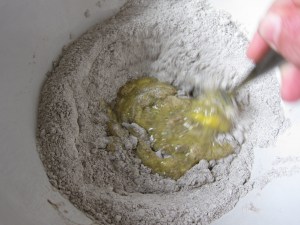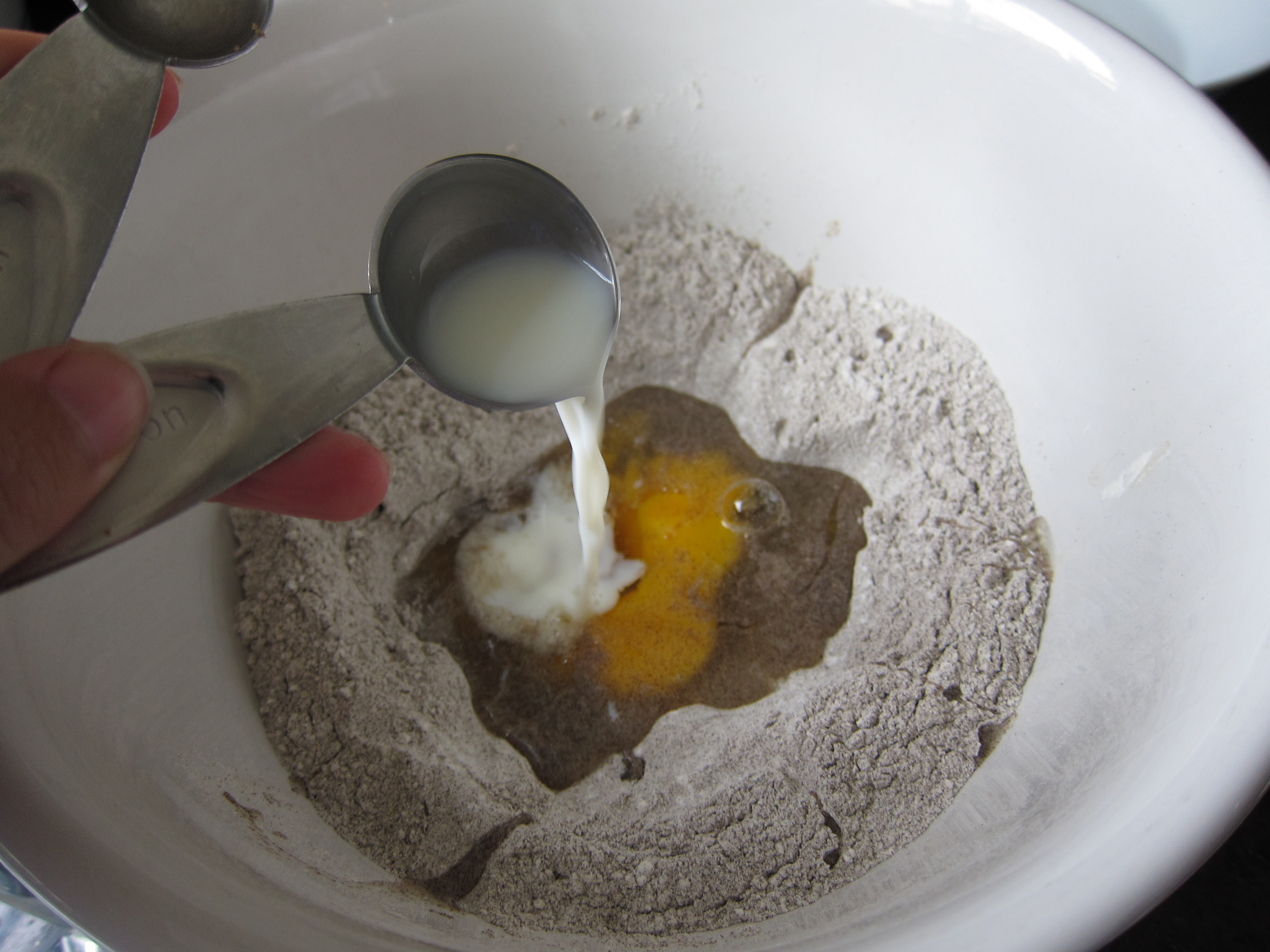 Combine 1 1/2 cups buckwheat and 1 cup all-purpose flour in a bowl. Add three eggs and one tablespoon of milk.