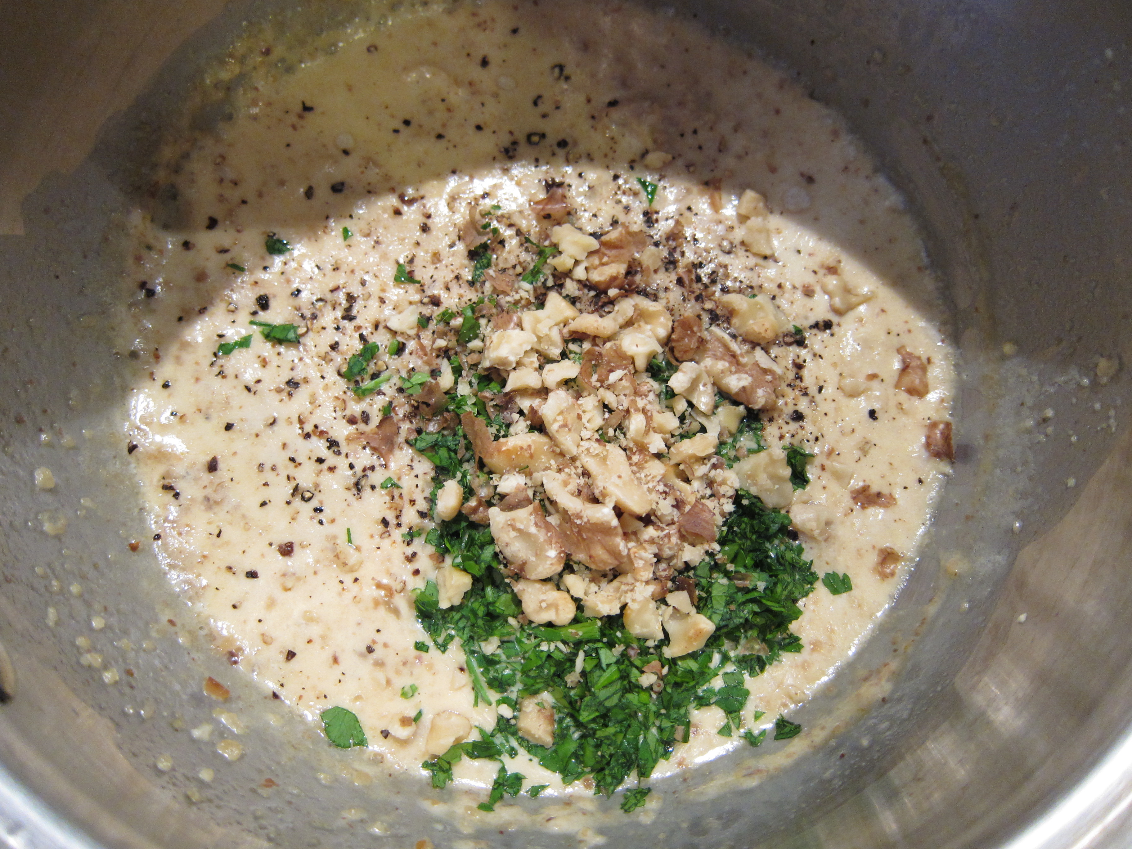 Add your additional chopped walnuts and parsley. Season with salt and pepper. Mix with your boiled noodles. (I know I didn’t mention boiling the noodles- they only take a minute… literally.)