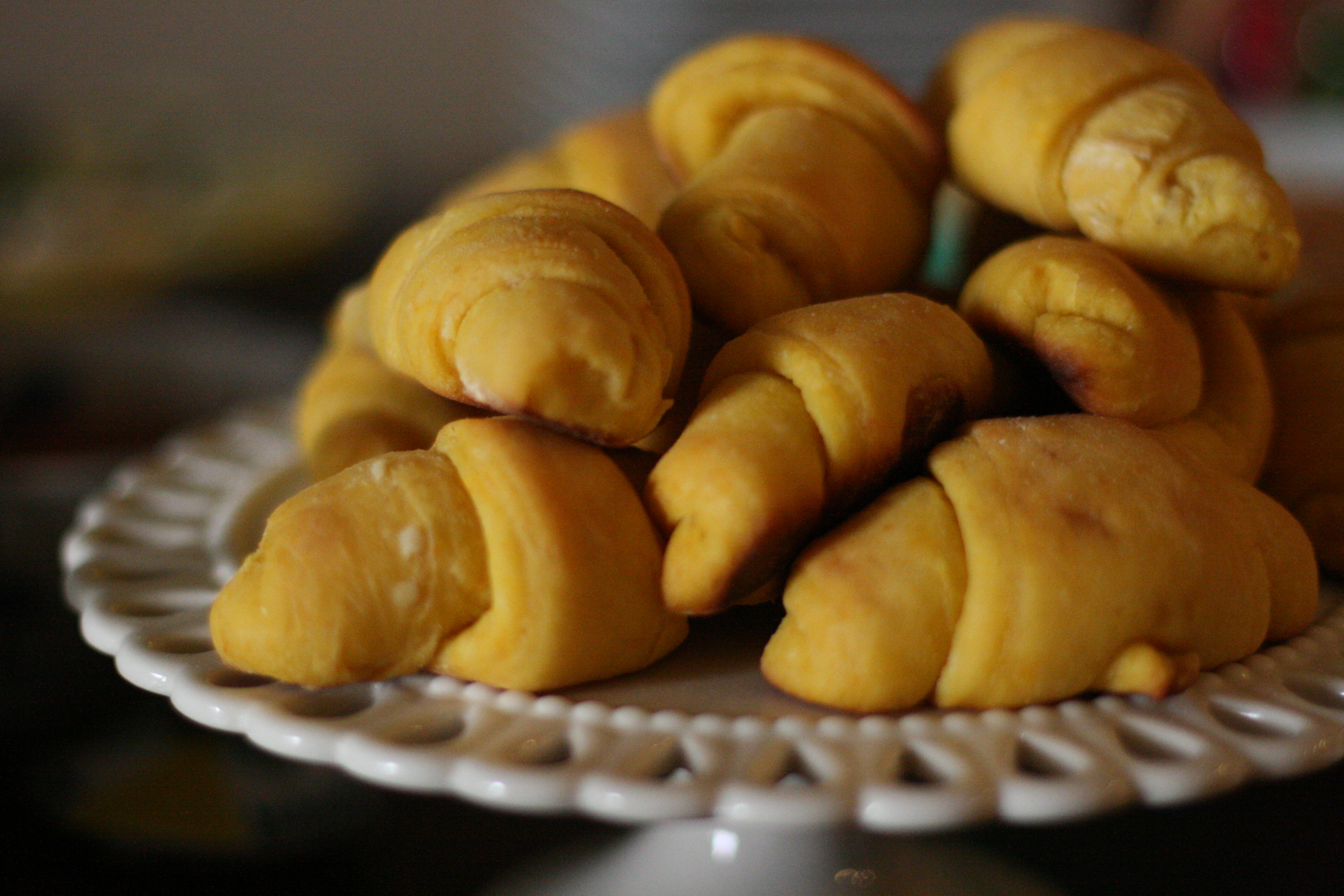 Heat milk and butter. Remove from heat and pour into a bowl. Add sugar, salt and squash. Add yeast to 1 cup of flour and mix with squash mixture (it will look lumpy but smooth out as you add more flour). Add remaining flour and stir. Dough will be sticky. Cover bowl with cloth and place in a warm place until it rises to almost double in size. Divide dough into 3 balls. On a cutting board place up to a cup of flour. Mix flour with 1 ball of sticky dough. Roll each ball into a large circle. Brush with melted butter. Cut into 12 pie shaped pieces. Starting with the larger end, roll dough into a crescent shape. Place rolls on buttered pans. Cover and place in a warm place until they rise.