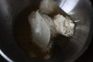 After a quick trip to the store- whip up your dressing… mayo, sour cream, celery salt, champagne vinegar, dry mustard, sugar, salt and pepper…