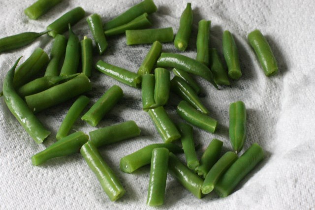 Cut some beans in one inch segments and boil for a couple minutes and then shock in an ice bath.