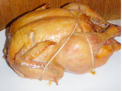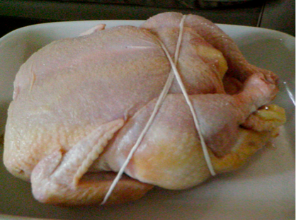 I have never trussed a chicken before and am not sure  this is correct but  it  seemed to work. I must admit that this is the best chicken I have ever made. I found the recipe on Epicurious.