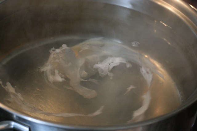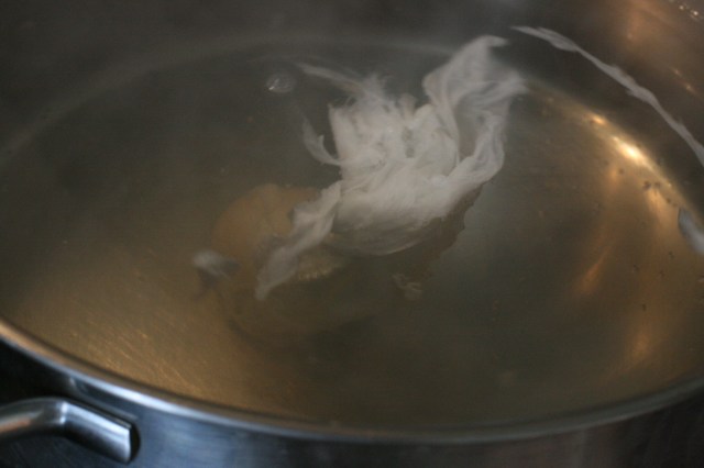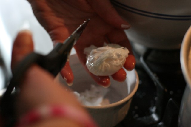 When it comes time to plate the eggs, trim off the crazy edges and warm them again in simmering water for just about 30 seconds.