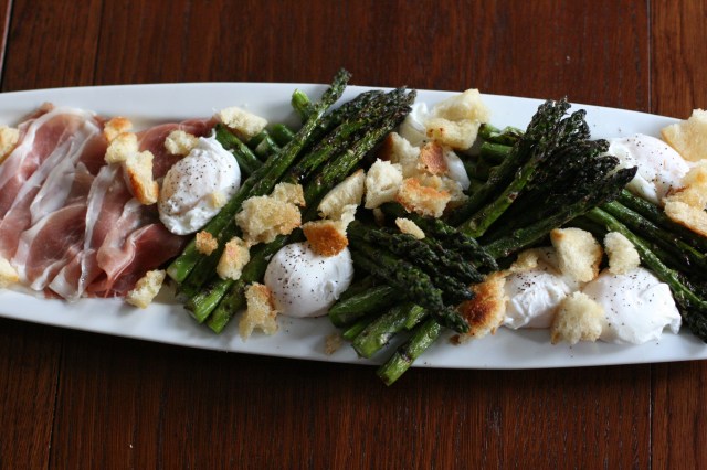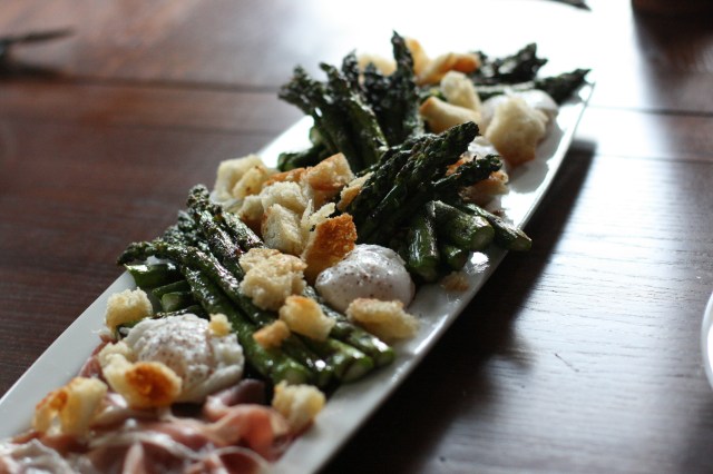 Grilled Asparagus with prosciutto, fried bread, poached egg, and aged balsamic vinegar