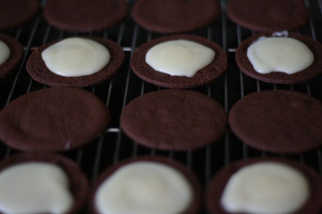 When they are cooled, turn half of the discs upside down and pipe some of the white chocolate cream mixture into the center.