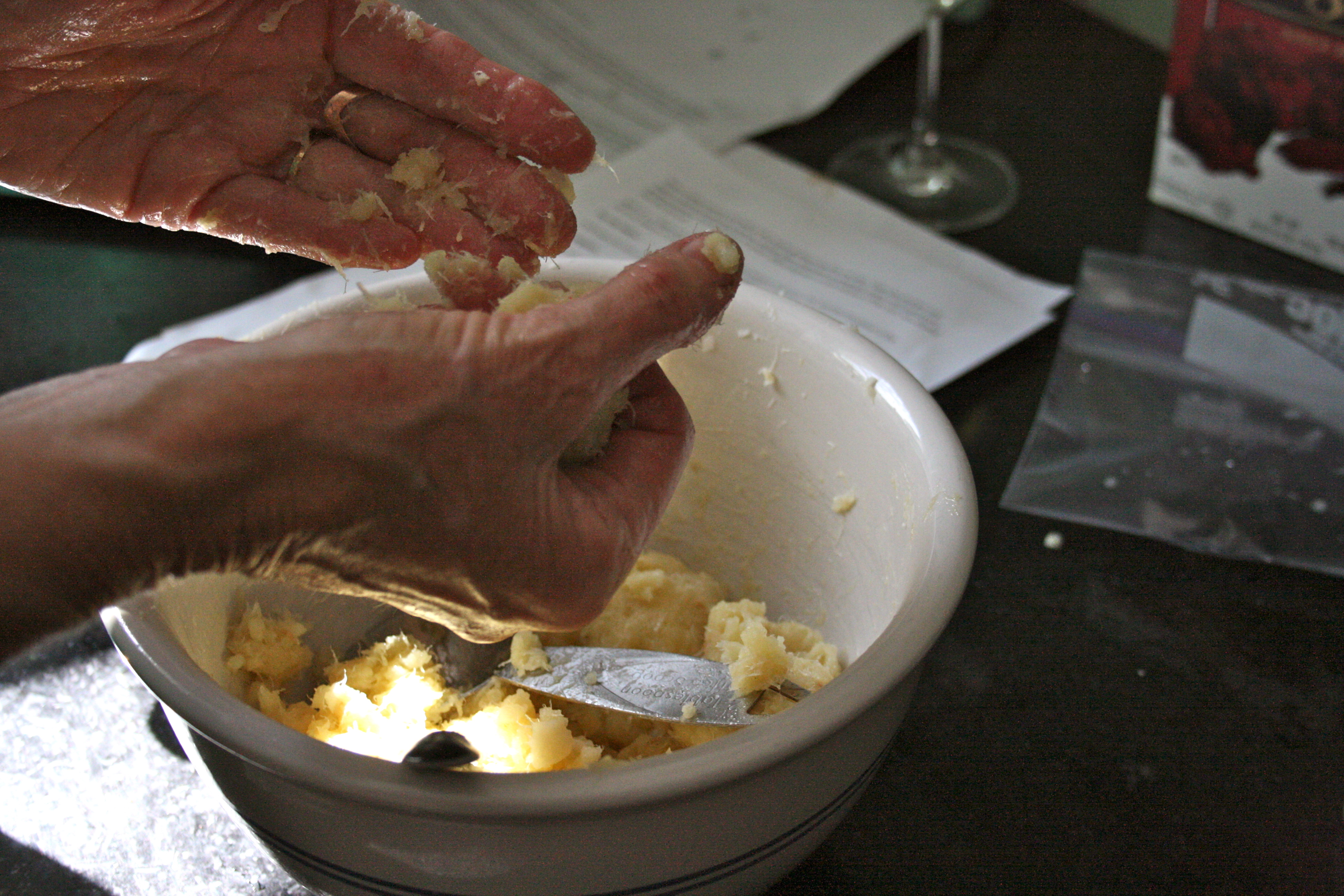 Cod is rehydrated and mixed with riced potatoes, garlic, olive oil some spices.