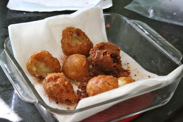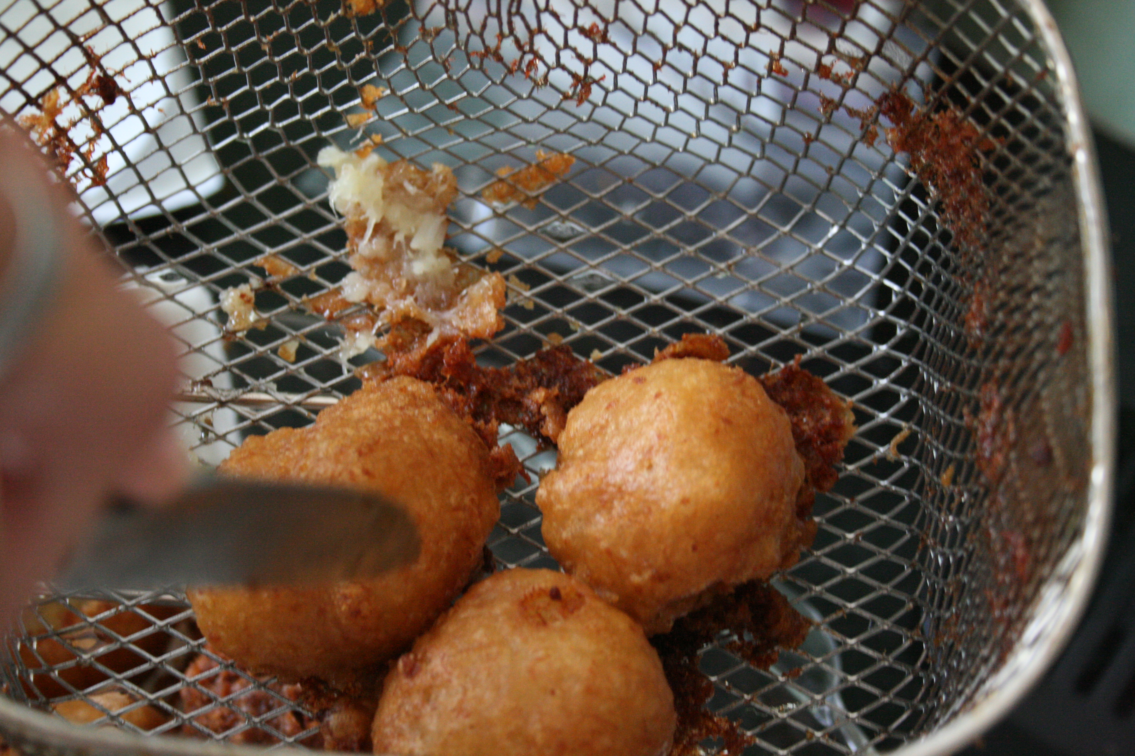 It’s hard to tell in this photo, but this ball has no innards. It seems all of the cod escaped into the depths of the fryer. At this point we are not confident in our first dish.