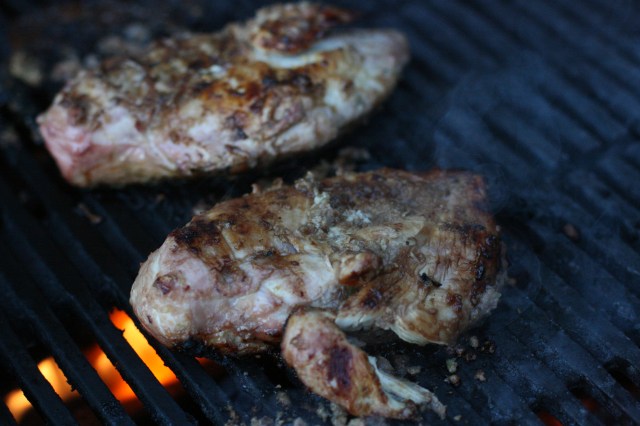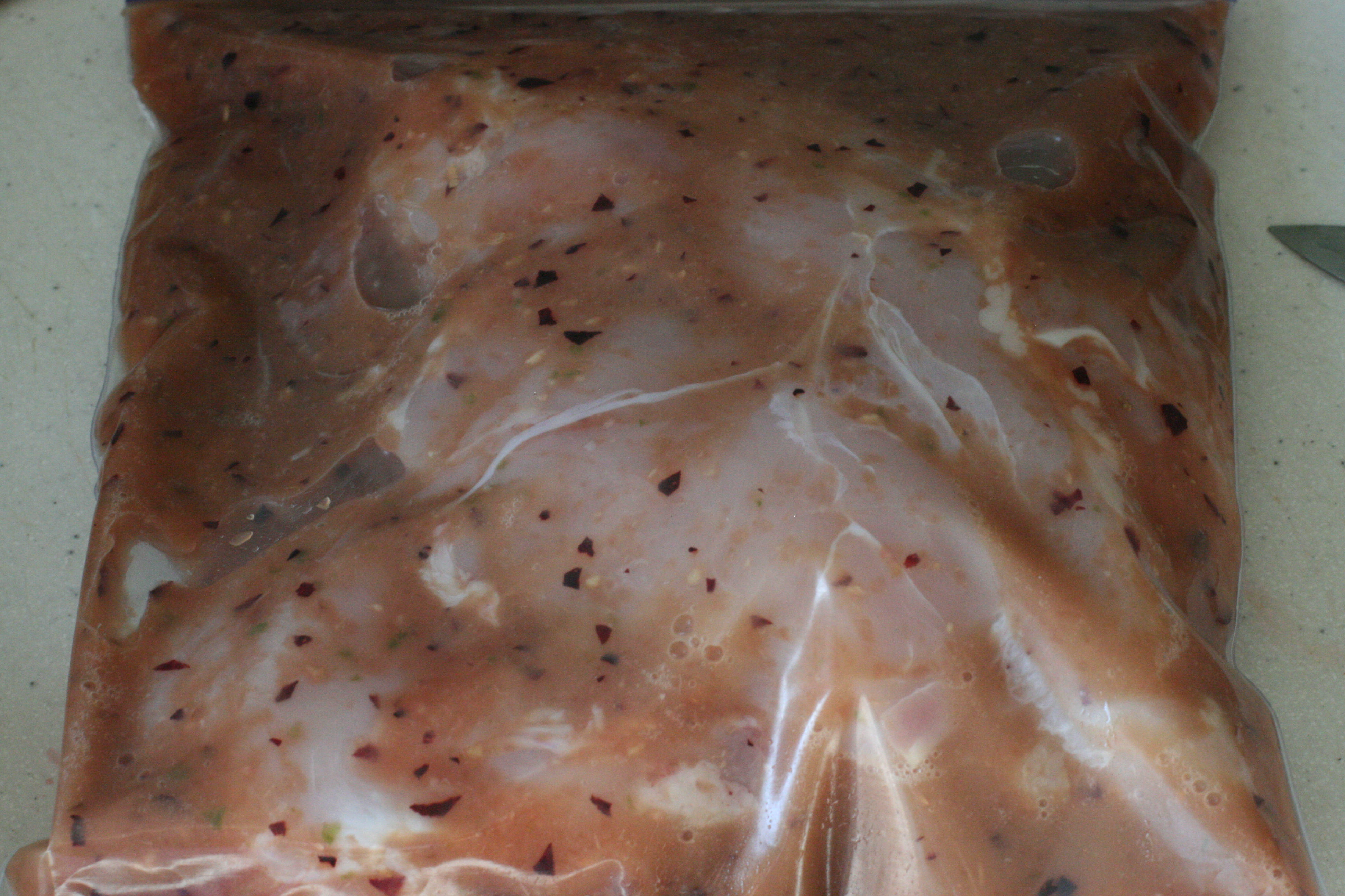 Chicken gets thrown in a marinade. I used boneless breasts because that’s what we had.