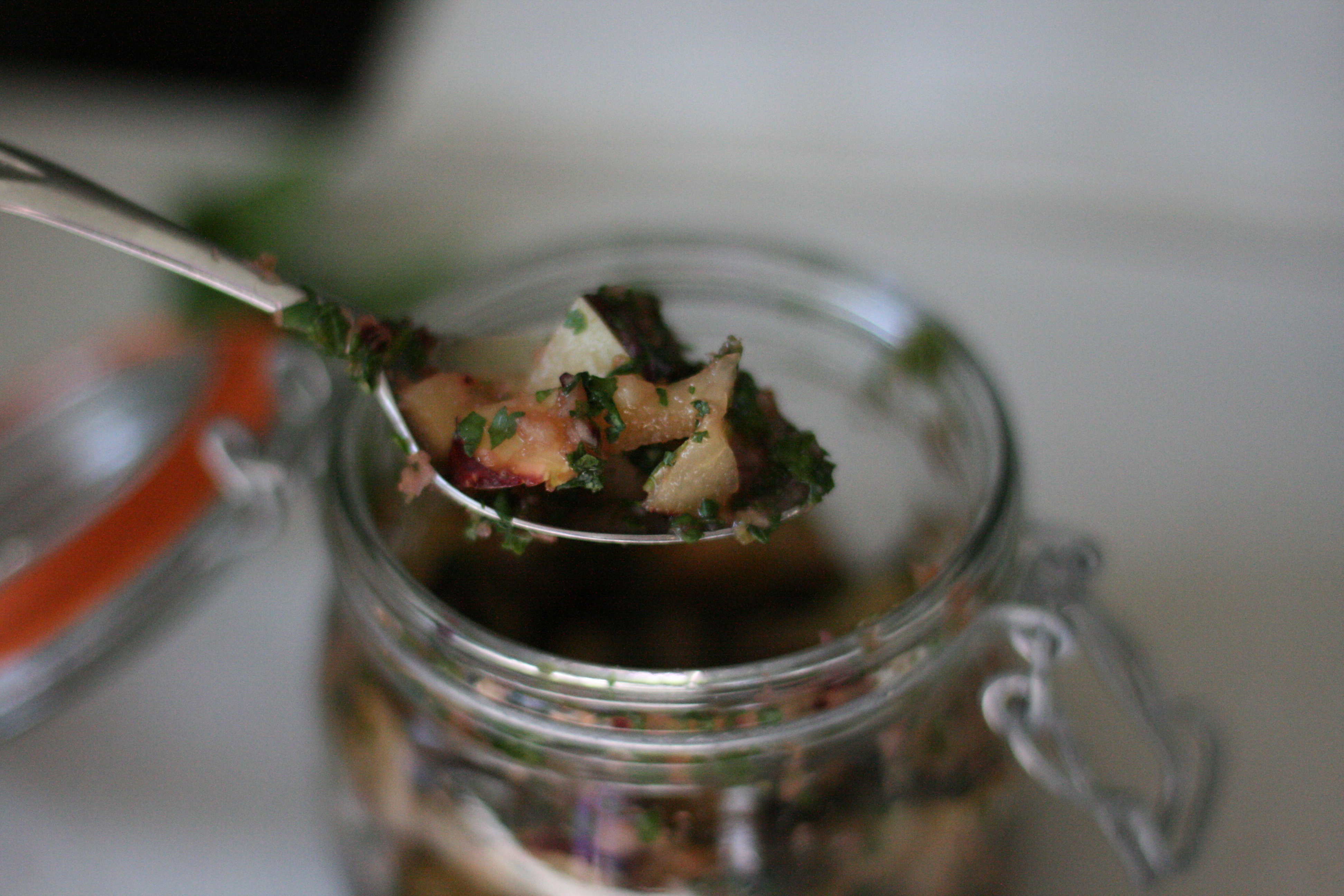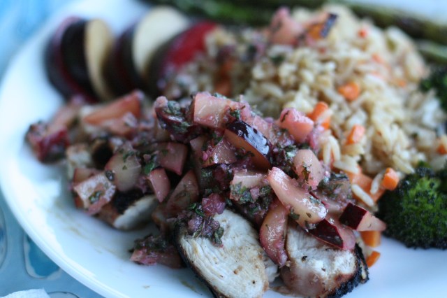 This has more plums, cilantro, red onion, mint, lime, jalapeño and reserved marinade. The book called for red plums which I think would have been a more attractive presentation may be- but again, I made this with what we had on hand.