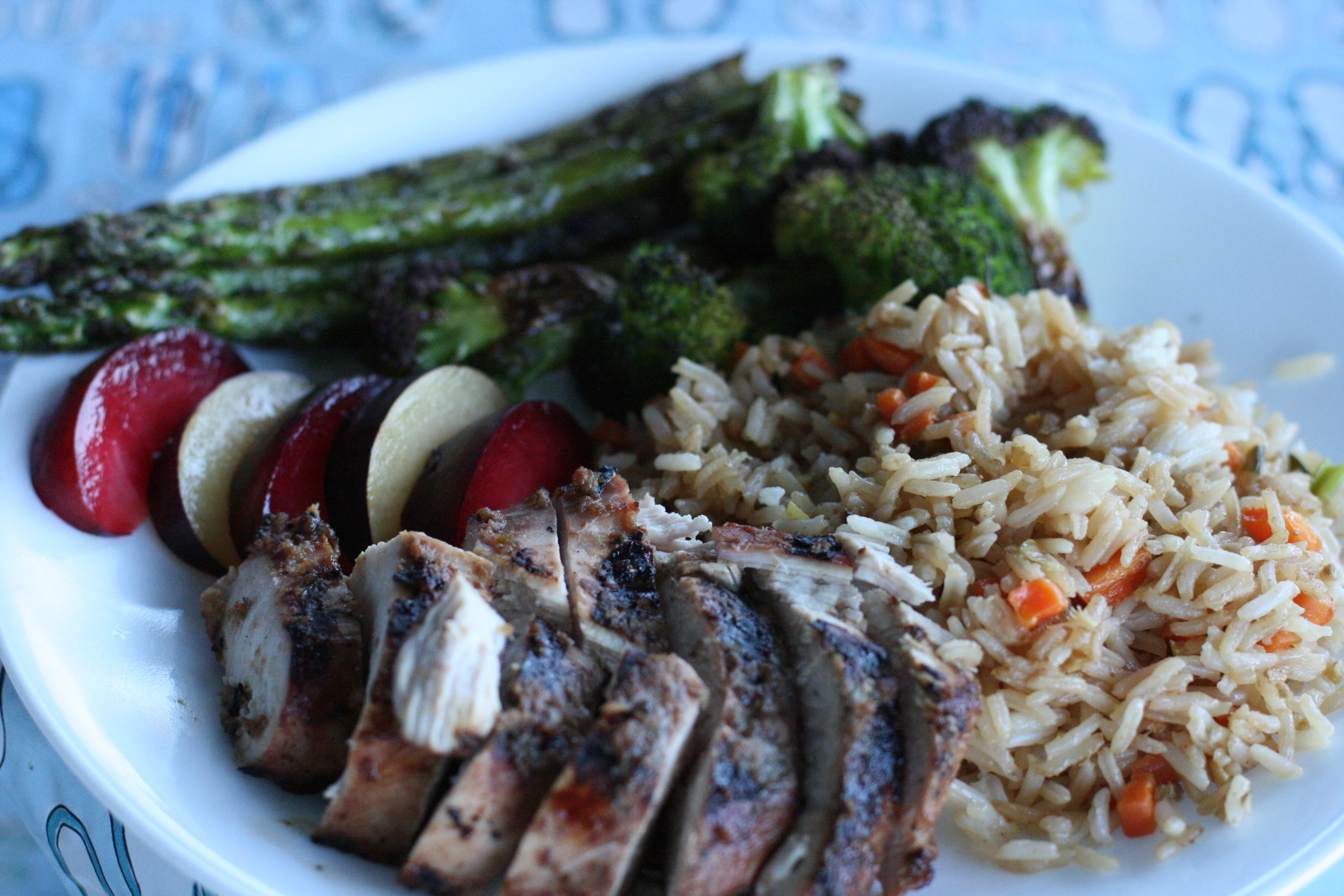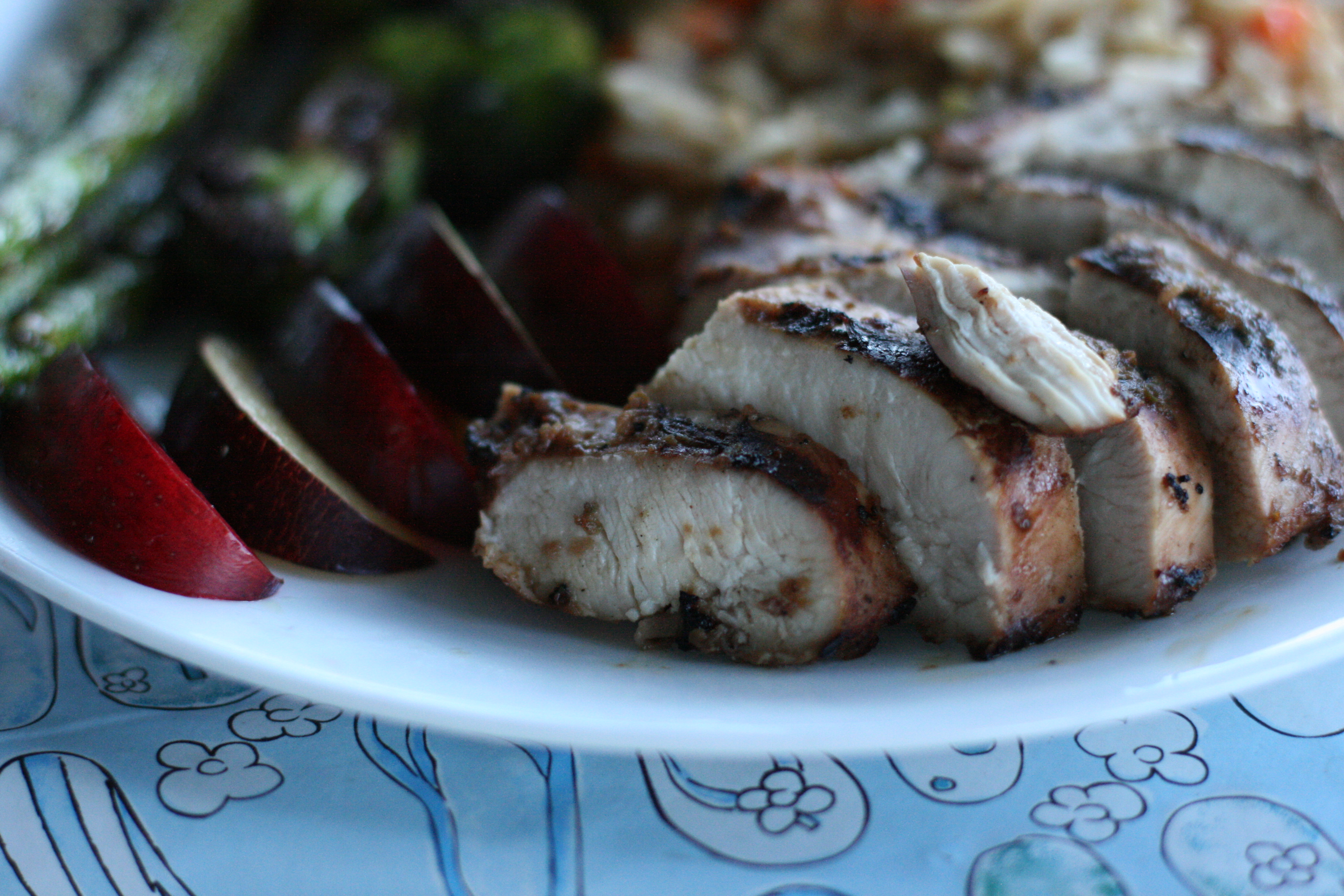 When everything is done, slice up some plums for garnish on the plate (be glad you went to the store and got red ones) and sit down to a wonderful dinner.
