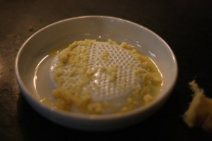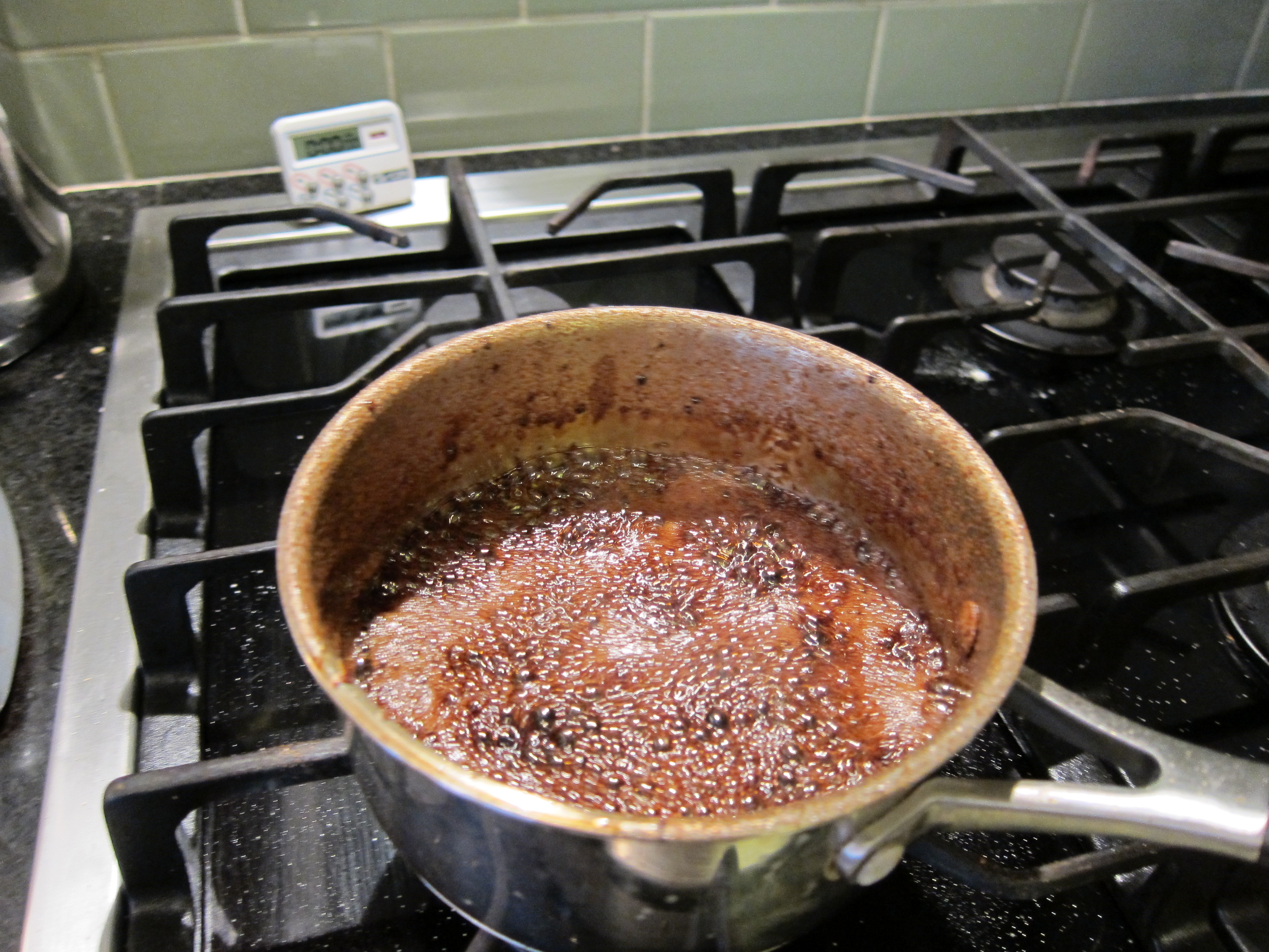 Starts with making the teriyaki sauce. MMM… This stuff is tasty and just three ingredients- Mirin, Soy Sauce, and Ginger, reduced by half. Cool and done. It turns out pretty thick and delicious.