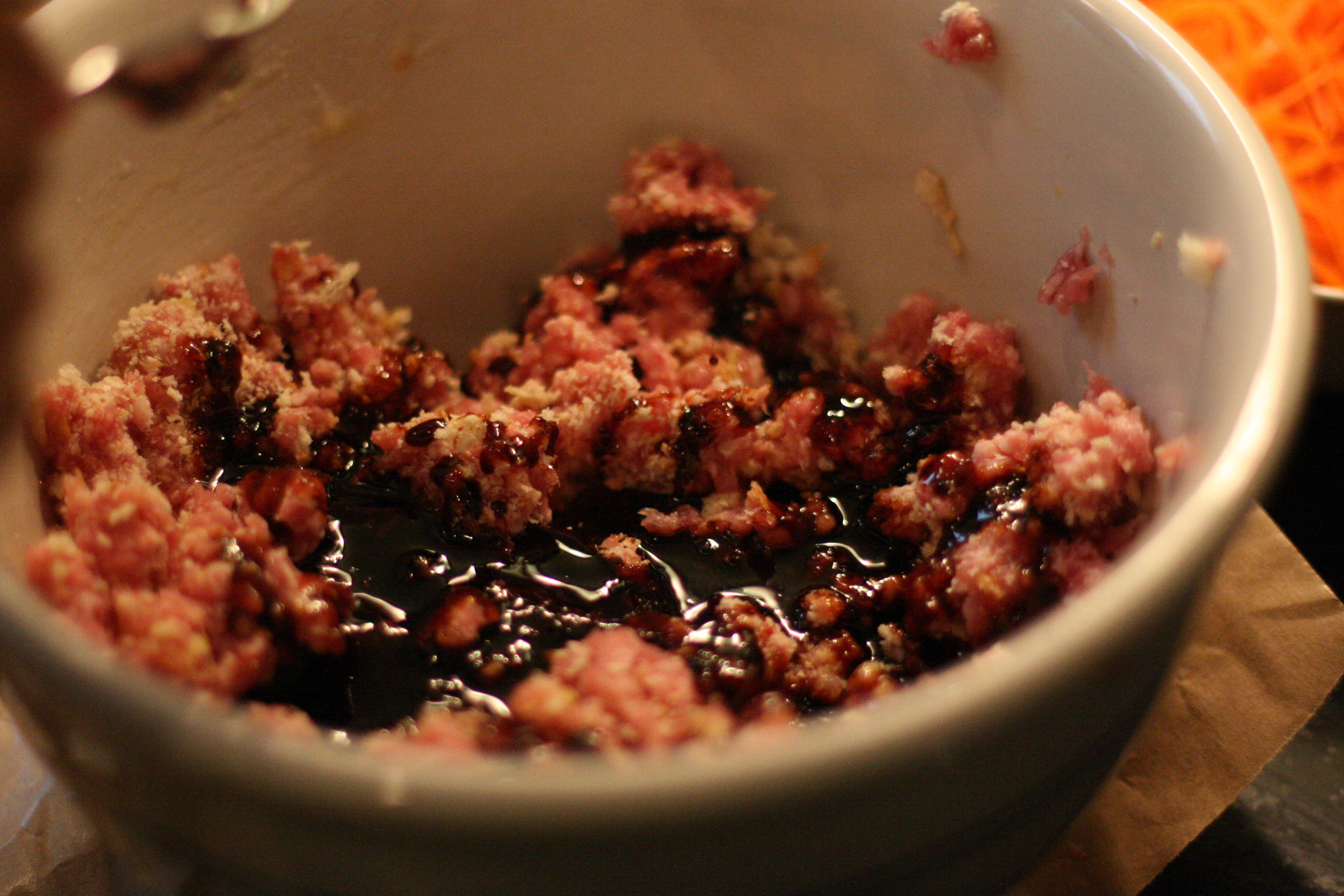 So these are made with ground pork, bread crumbs, onion, and an egg- sort of what you would do if you were making meatballs or meat loaf. All combined together. Then add the Teriyaki Sauce.