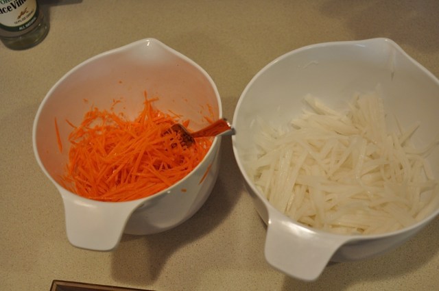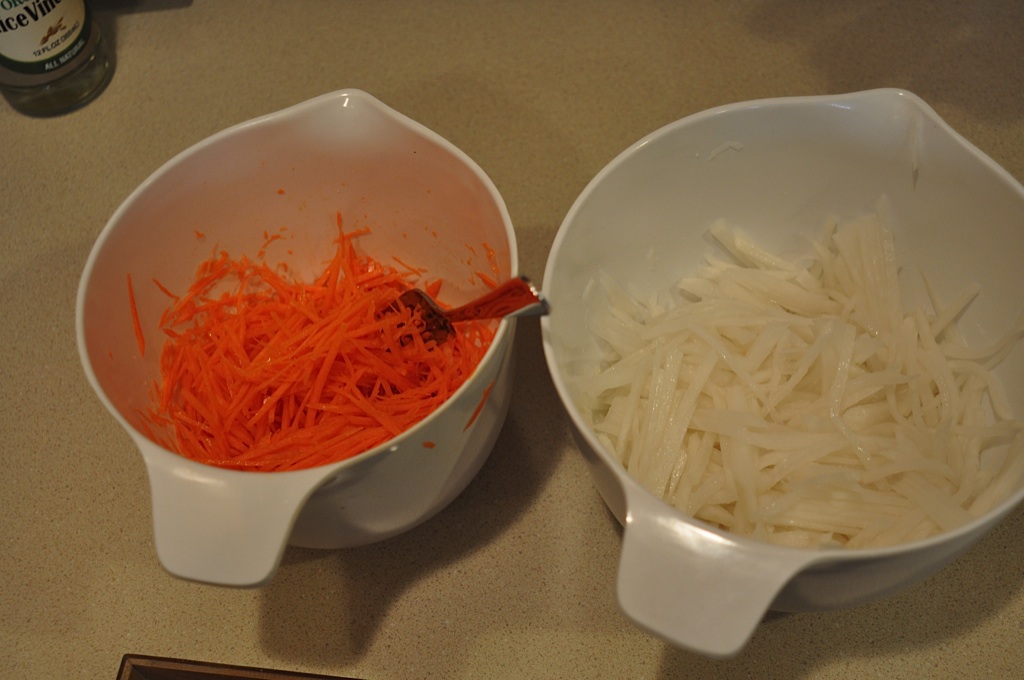Second task, making the Sweet-Vinegared Daikon and Carrots. I treated myself to a new mandolyn, and after a little trial and error it went fairly fast julienning the carrots and daikon. Sprinkle the veggies with a little salt and then squeeze it out. Heat up the vinegar and sugar and then mix and let sit in the fridge (overnight.)