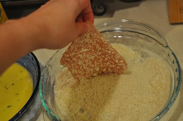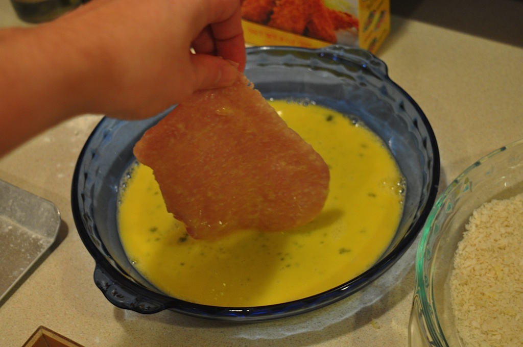 Dip the pork in the egg.