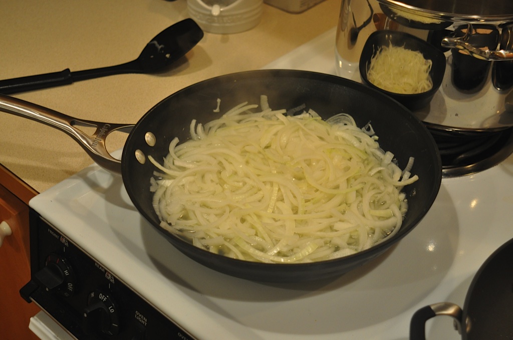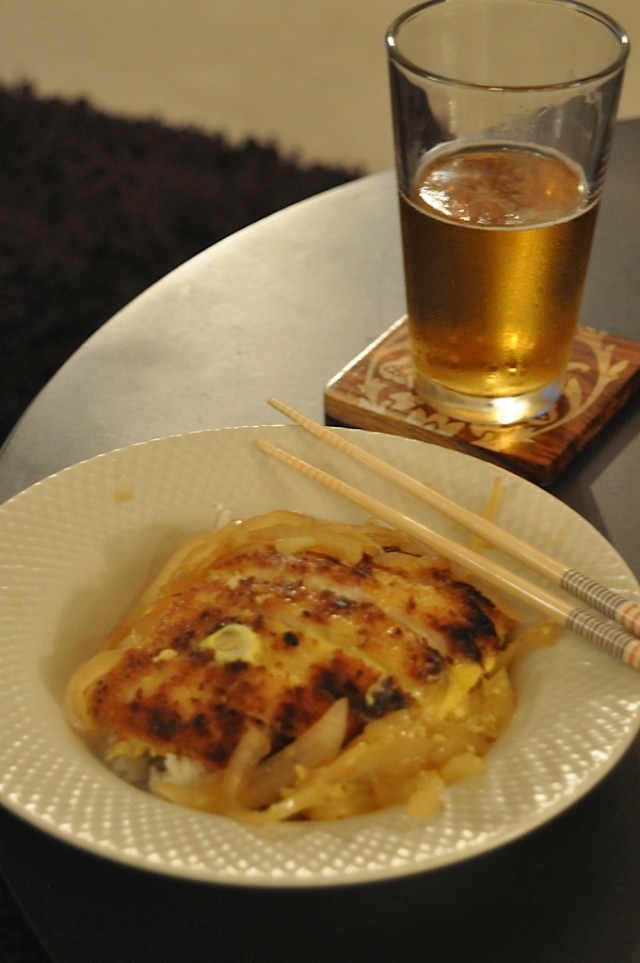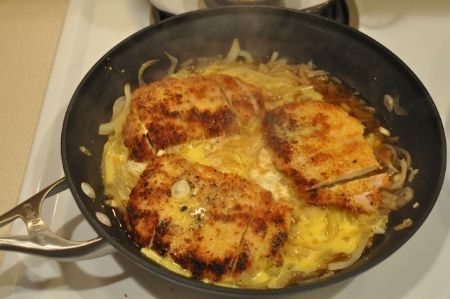 Lastly, making the Katsudon (Pork Cutlets with Soy Sauce-Flavored Egg.) I’ve often had this in restaurants and can’t seem to find a place that does it well. This was sooooo good, and exactly how I dreamed it would be. It was pretty easy, just a little preparation ahead of time.Making the Dashi was the first step. Then pounding out the pork cutlets and dipping them in flour, egg and panko. I didn’t make my own Panko as she suggested, cause I already had too much on my plate. I just bought it in a box at Uwaji. Fry up the cutlets in a little peanut oil and then slice them. Meanwhile cook the thinly sliced onion, ginger and dashi in a pan. Once I smelled this cooking, I realized that I was on track! Mix in some soy sauce and mirin. Then place the cutlets on top and pour (swirl) the beaten egg over the top. Once it’s pretty much cooked scoop it up on top of rice. I served it with some Sapporo beer and ta-da! It was soooo good.