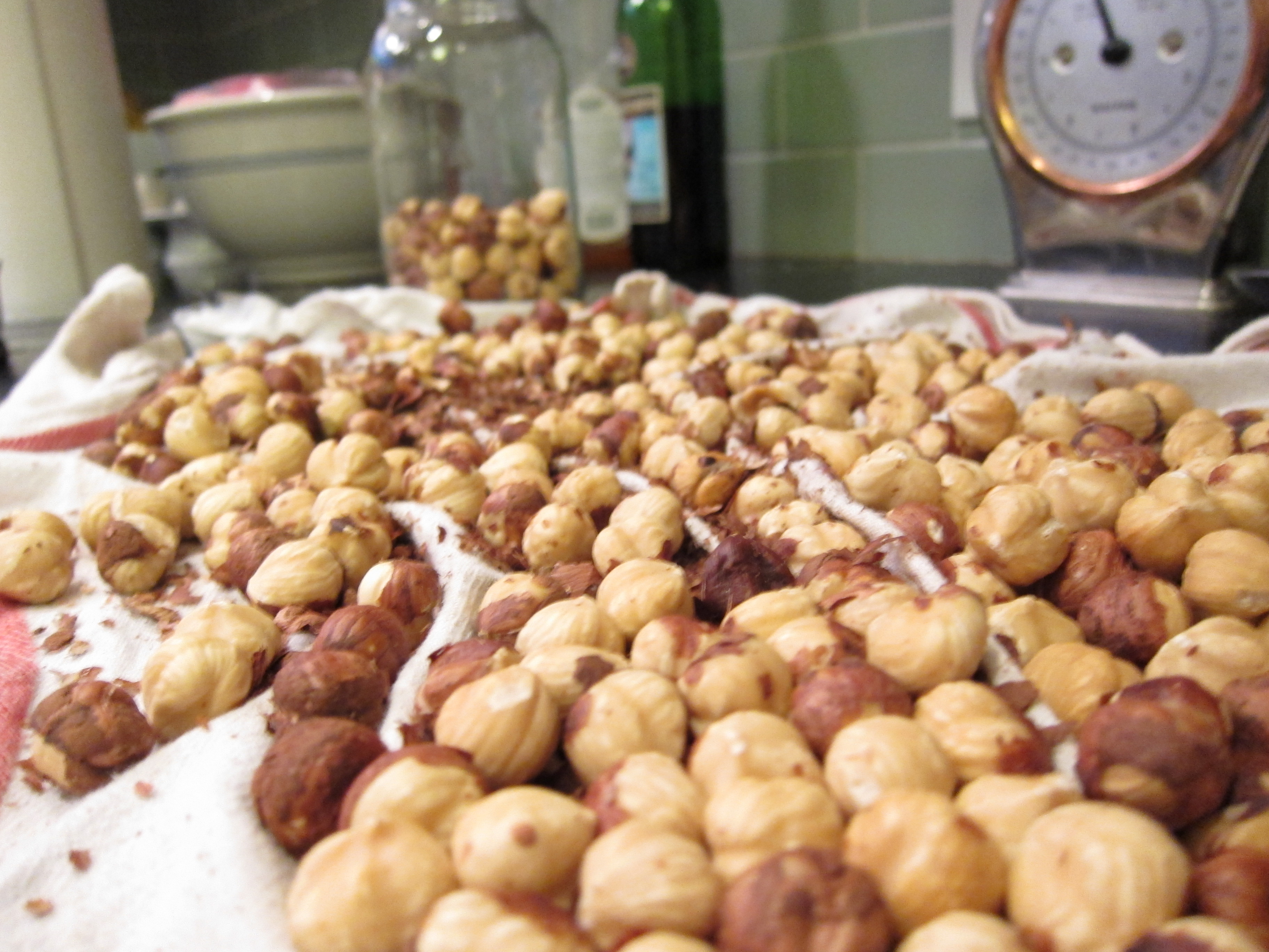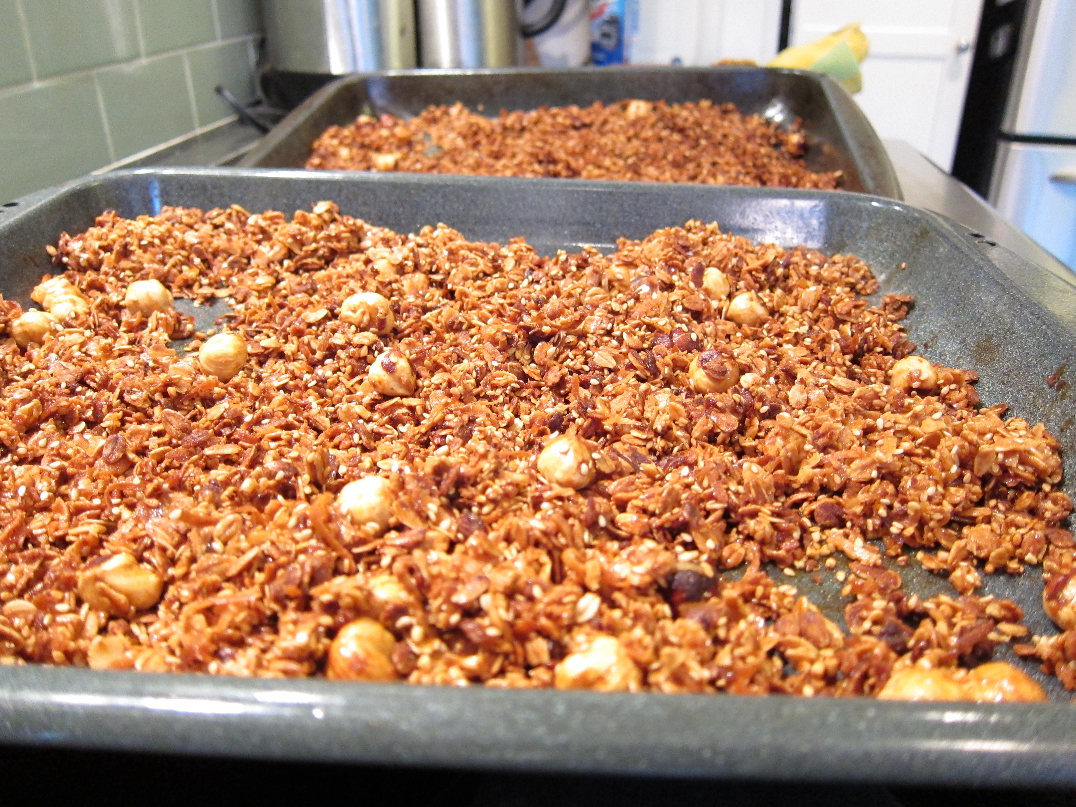 It makes quite a bit. We’ve been munching on this for a couple of weeks… with milk, with yogurt, with ice cream, and straight out of the container. I like the rich color and the flavor- especially the hazelnuts- it’s a bit more sticky than granola I’ve made in the past- sticky might not be the right word- when I’m eating it it doesn’t seem sticky, but it takes a little more effort to get it out of the container. I suppose that might be a good thing!