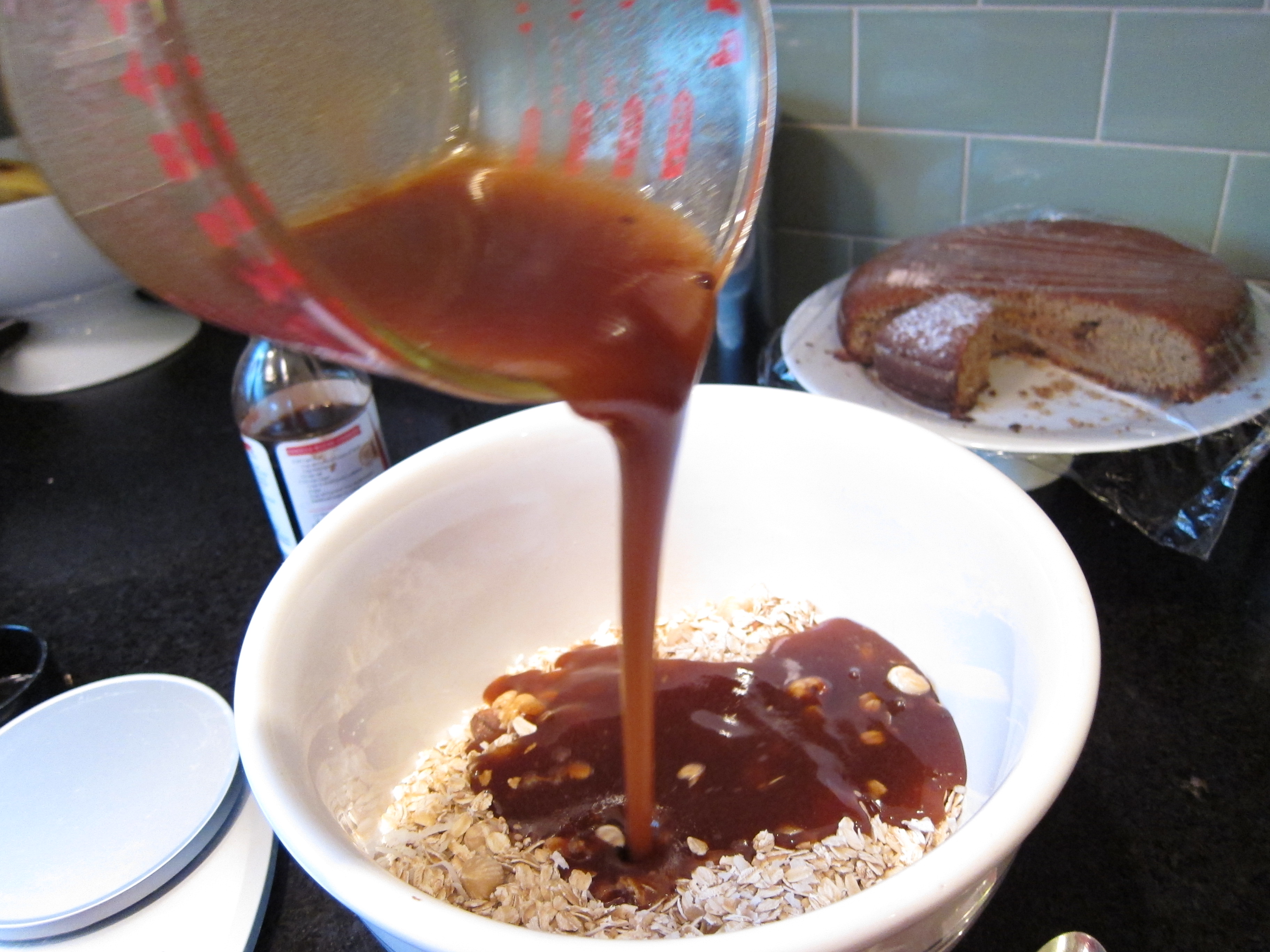 Weighed out the wet ingredients (less dishes). A little honey, molasses, brown sugar oil, etc… what could be bad? Pour that in with the dry… oats, sesame seeds, coconut…