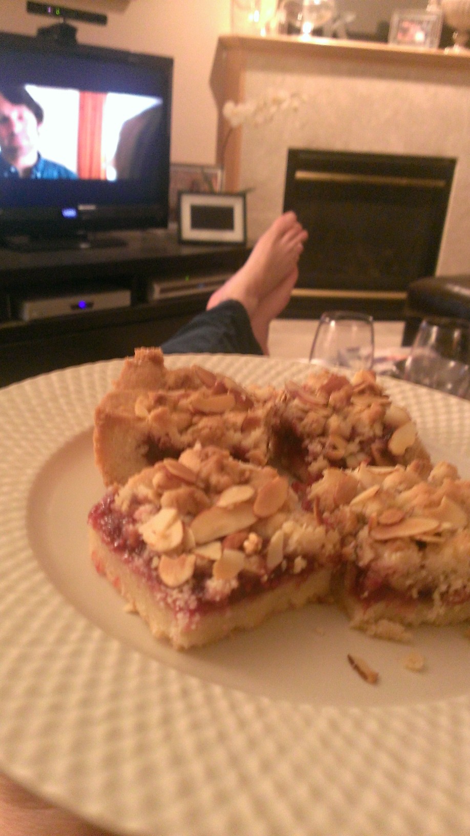 Lightly press two-thirds of the dough into a 9×9 pan. Spread some good-quality raspberry jam on top. I used Bonne Maman and it was good. I didn’t quite use the 10-12 oz she called for (as I’m finding she likes her food saucy.)