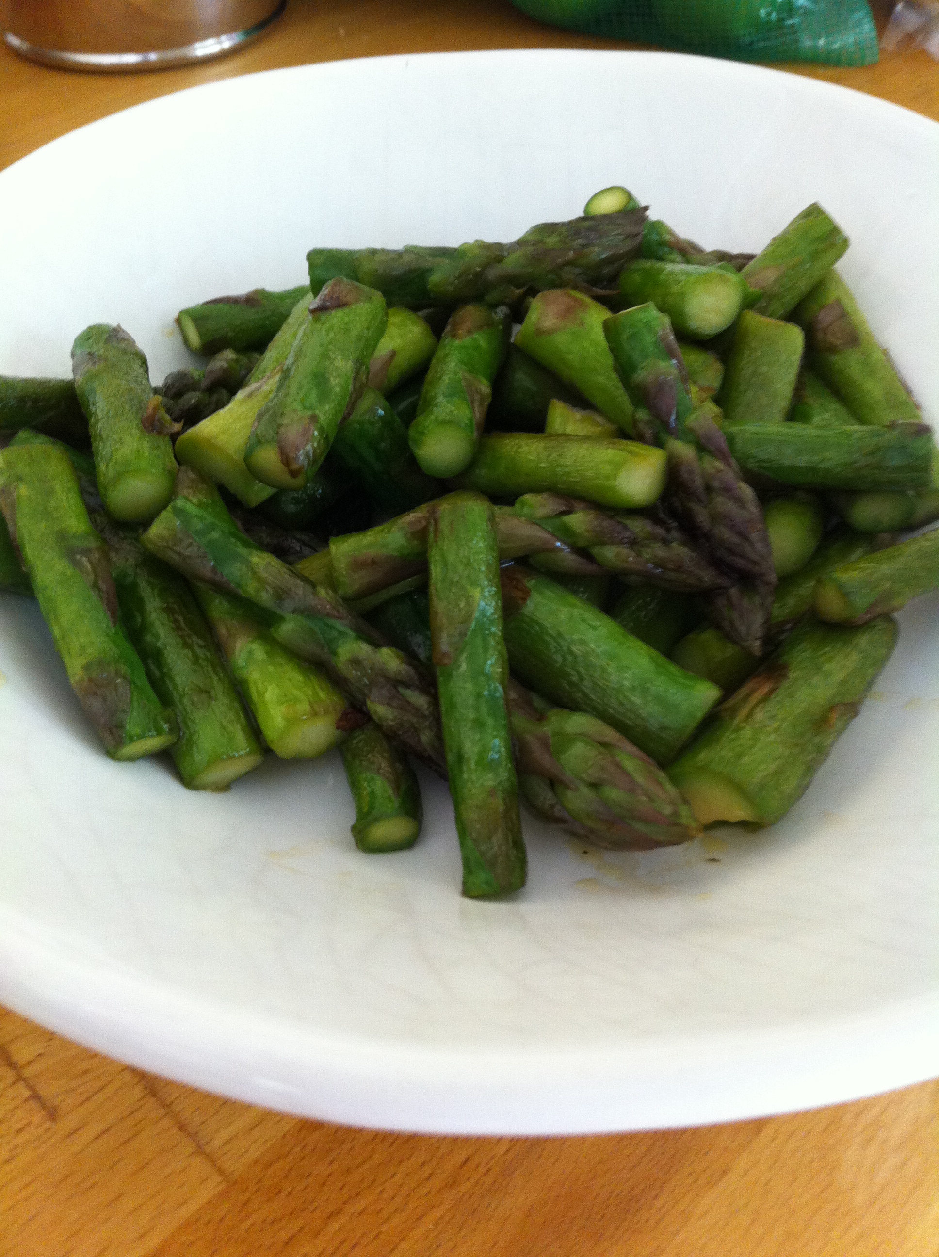 Asparagus is cooked in a heavy skillet with some olive oil until crisp-tender.
