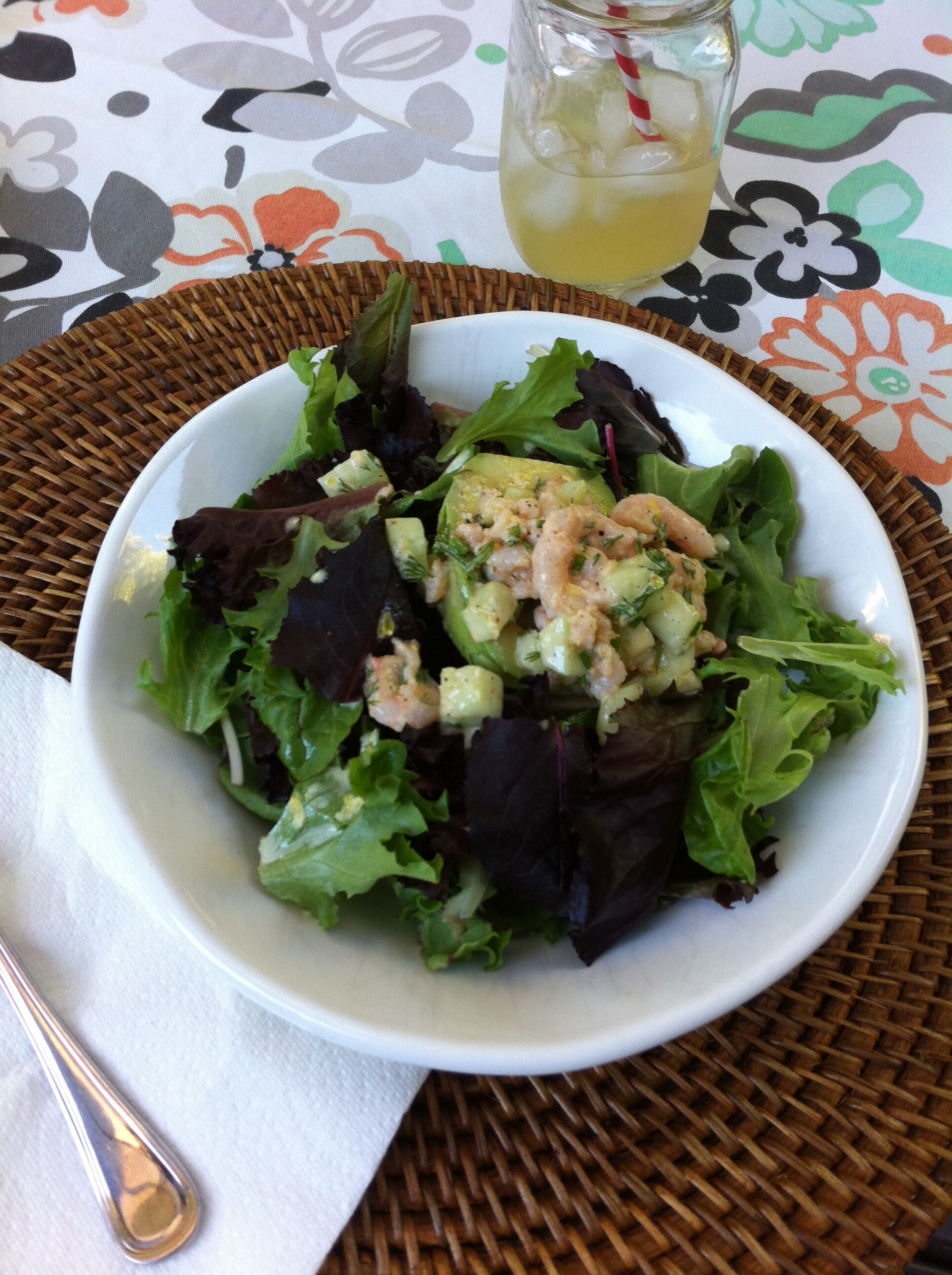 Assemble your salad by drizzling a little dressing over your greens. The rest of the dressing gets mixed into the shrimp salad. Then take your half avocado and place the shrimp salad inside the scooped out cavity. You will have plenty of shrimp salad so feel free to put generous amounts on each plate. . .you won’t be disappointed.