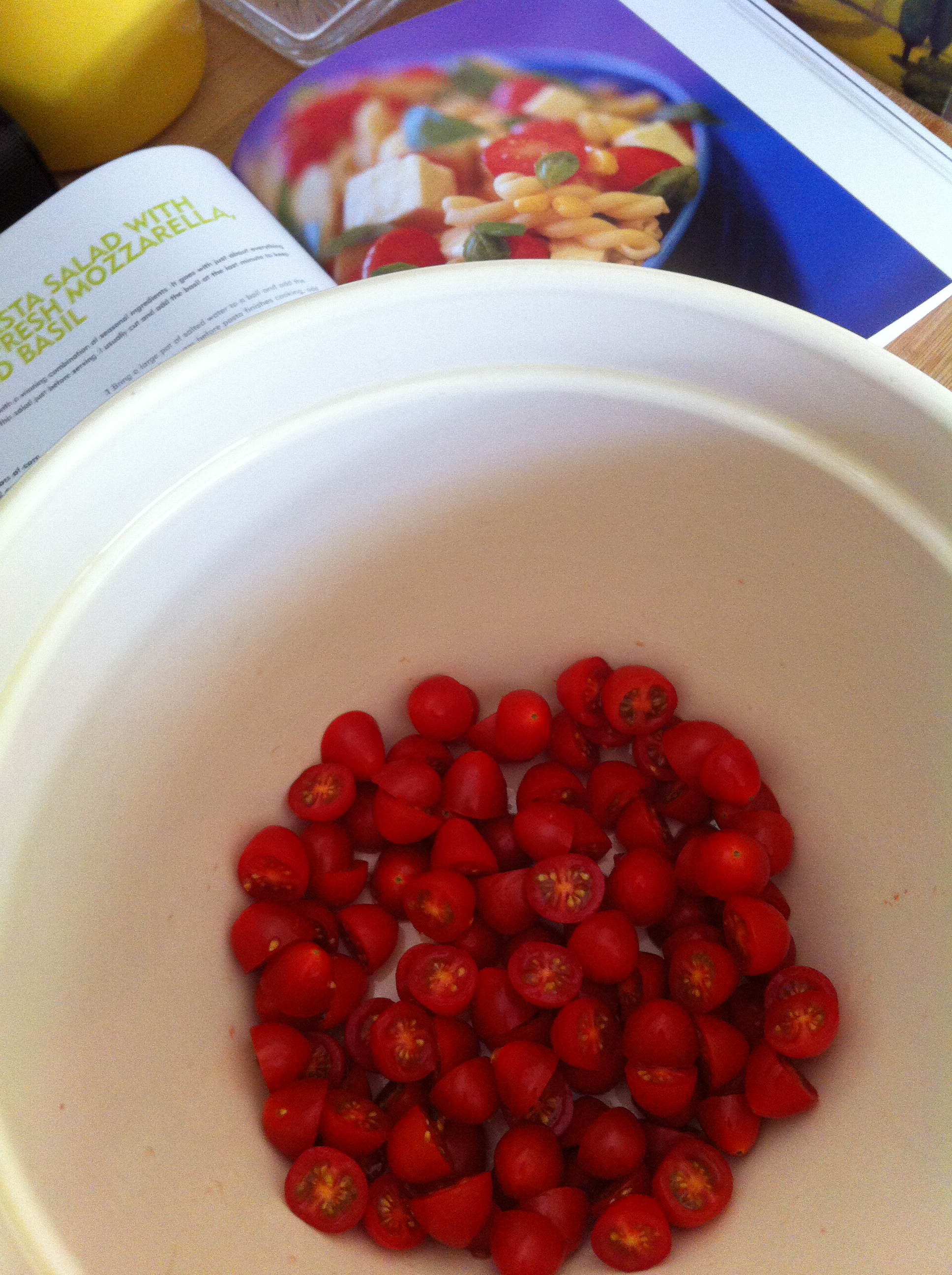 This is the perfect salad (pg.156) to bring to a party. Or, if you make it and miss the party like I did, you will have endless amounts of pasta salad to consume. Thank goodness it’s yummy. I will say though, like Kelli mentioned in her last salad blog. . .something was missing from this salad. . .and I’m pretty sure it was salt. I’m not sure if some mozzarella cheeses are saltier than others, I’m guessing mine wasn’t a very salty version. I passed along some of this salad to my mom and she said she ended up adding some kalamata olives. She apparently thought it needed a little extra salt, too.