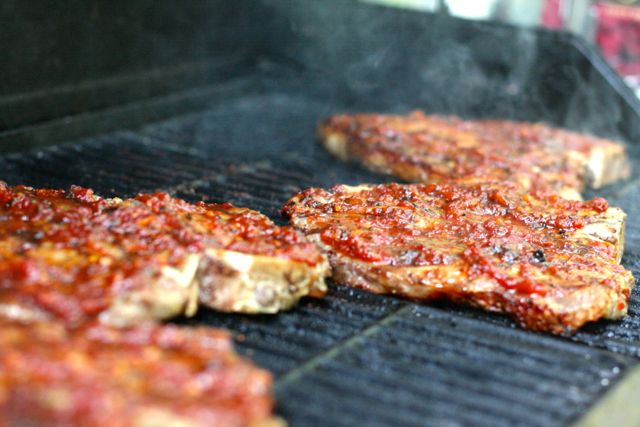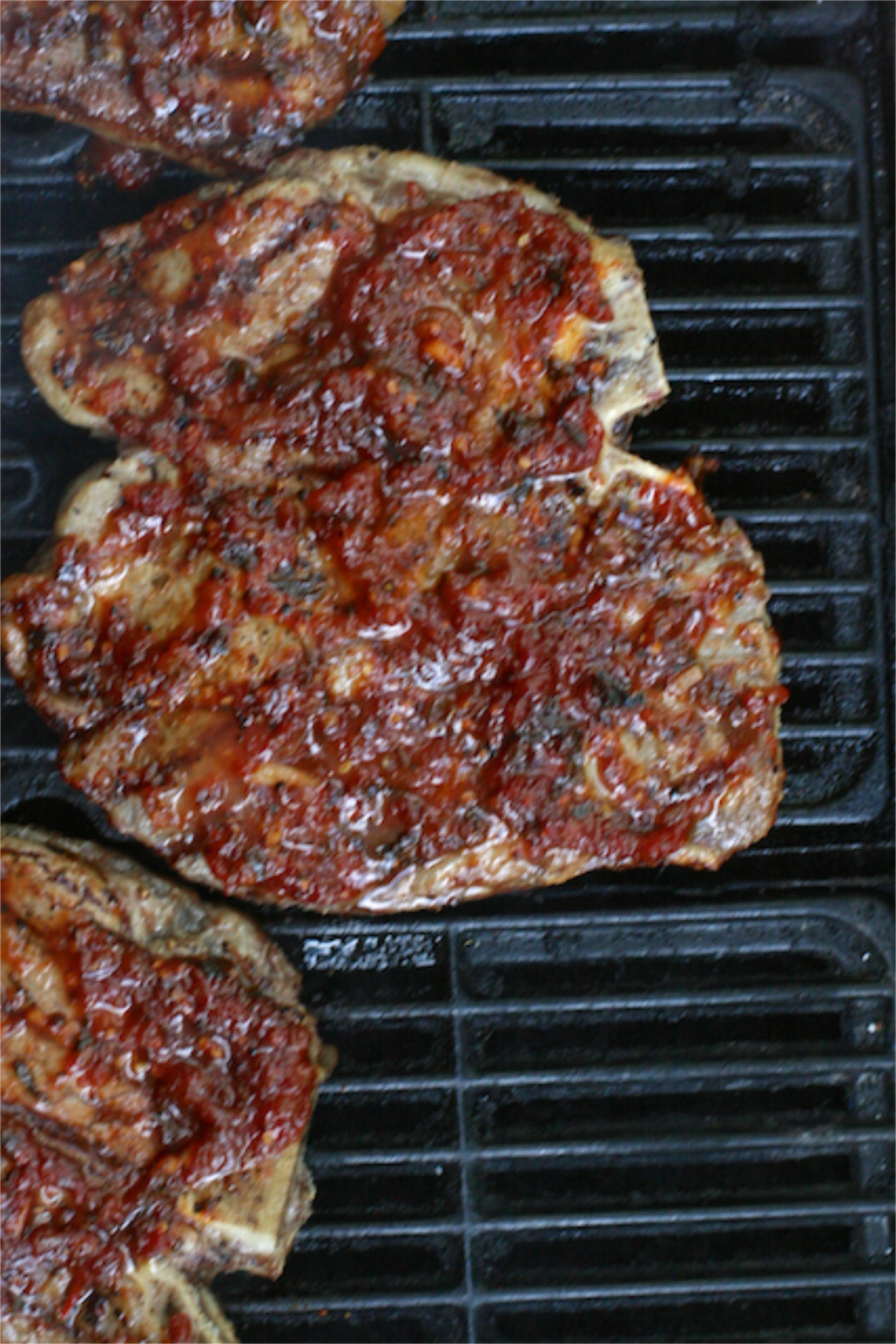 Carol brought the Porterhouse Steaks- which were gorgeous. They got brushed with the BBQ sauce.