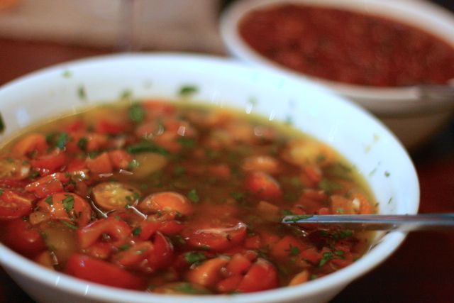 Here is the salad- which is why I had it in quotes. More Dressing than tomato but it goes on top of the steaks and is perfect. You might also notice the extra BBQ sauce in the background for passing at the table.