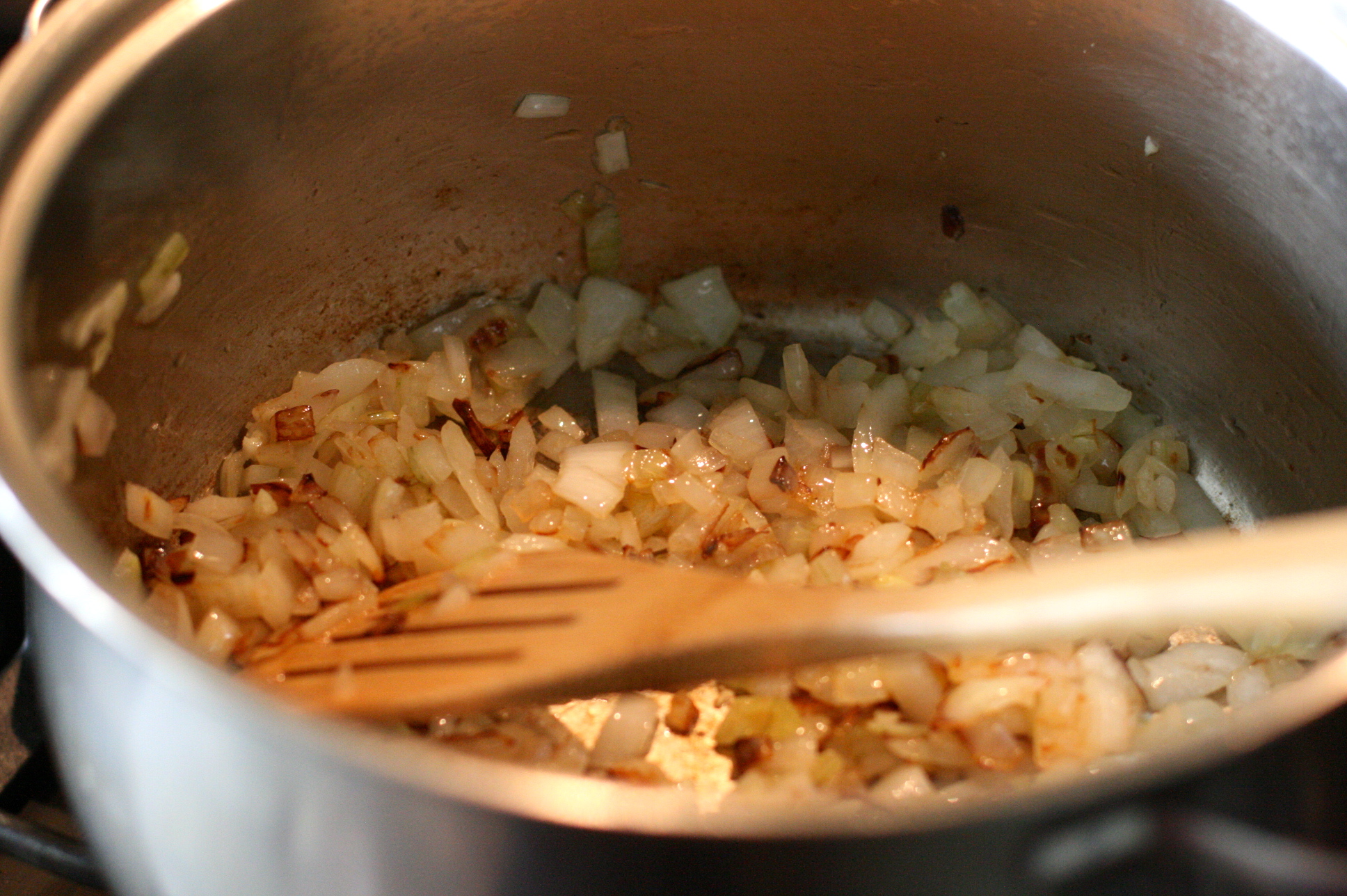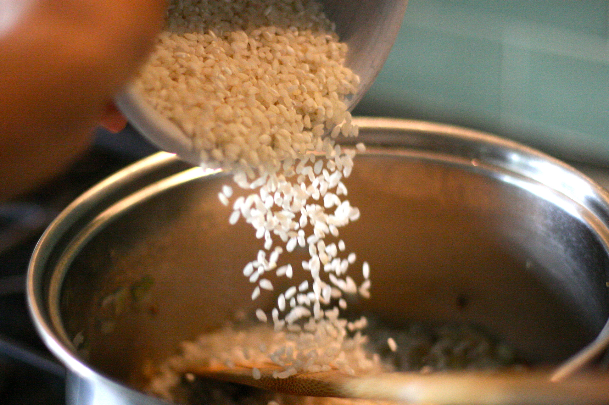 While they are resting you can start the risotto. Very similar to typical risotto- onions and garlic in olive oil….