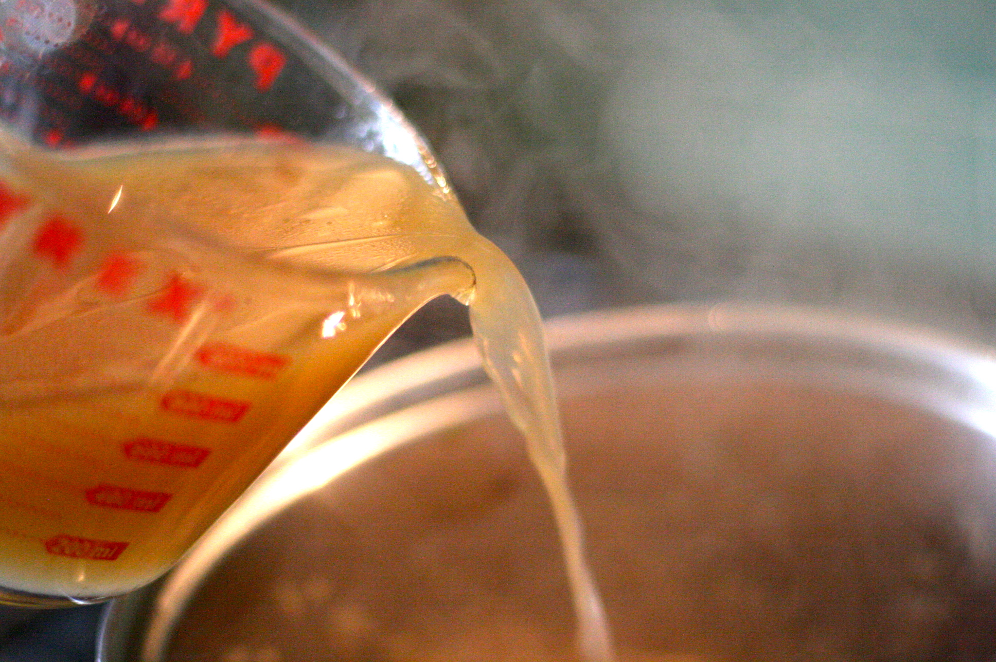 This is where it gets a little different- instead of white wine, the brown bits gets scraped off with light beer- then add chicken broth very slowly. It took about 30 minutes before it was all soaked in.