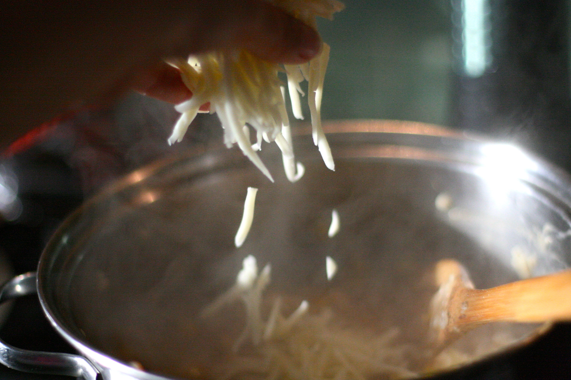 At the very end of the chicken broth, add corn as well… and when it’s all soaked in, monterey jack cheese.
