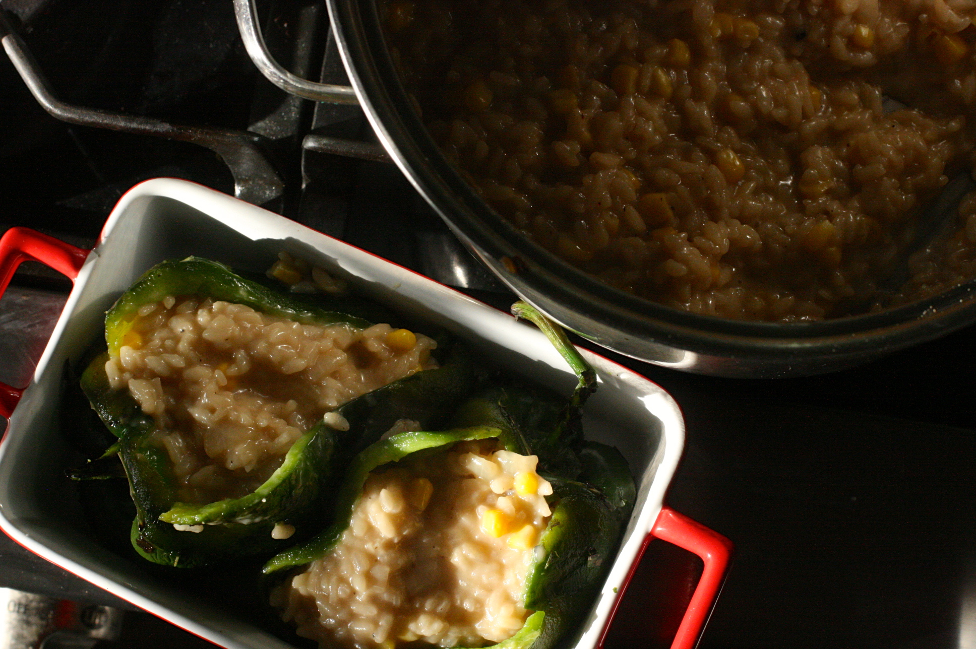 Stuff the previously roasted poblanos with the risotto.