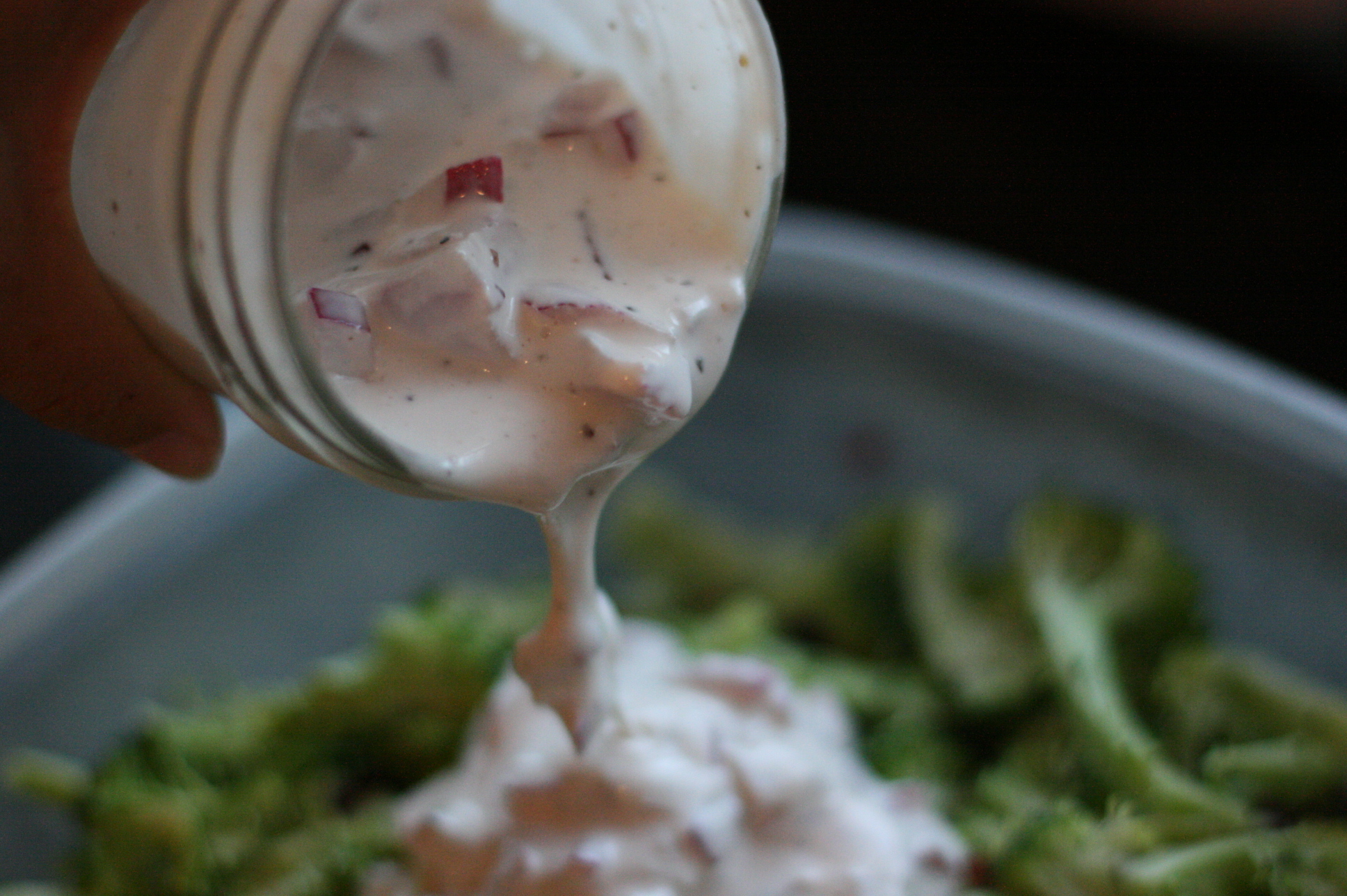All of the dressing ingredients get mixed together- nothing fancy- buttermilk, mayo, cider vinegar, sugar, red onion. Add to the salad and toss.