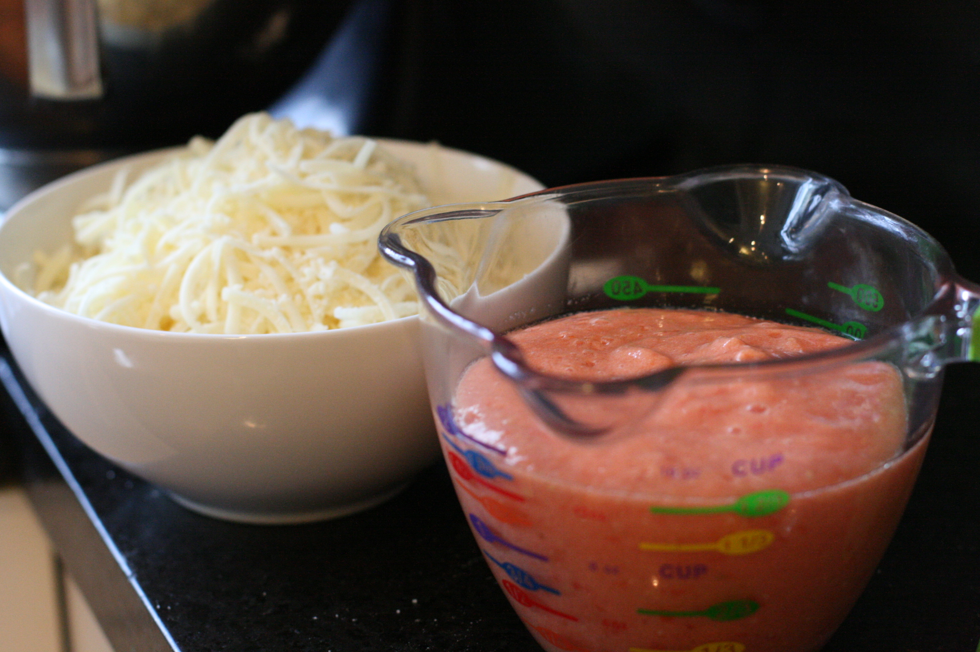 For the Sauce, I took the last of the tomatoes in the garden and whirled them in the food processor with some garlic and salt. The color is really pink- which was sort of weird- but we rolled with it.
