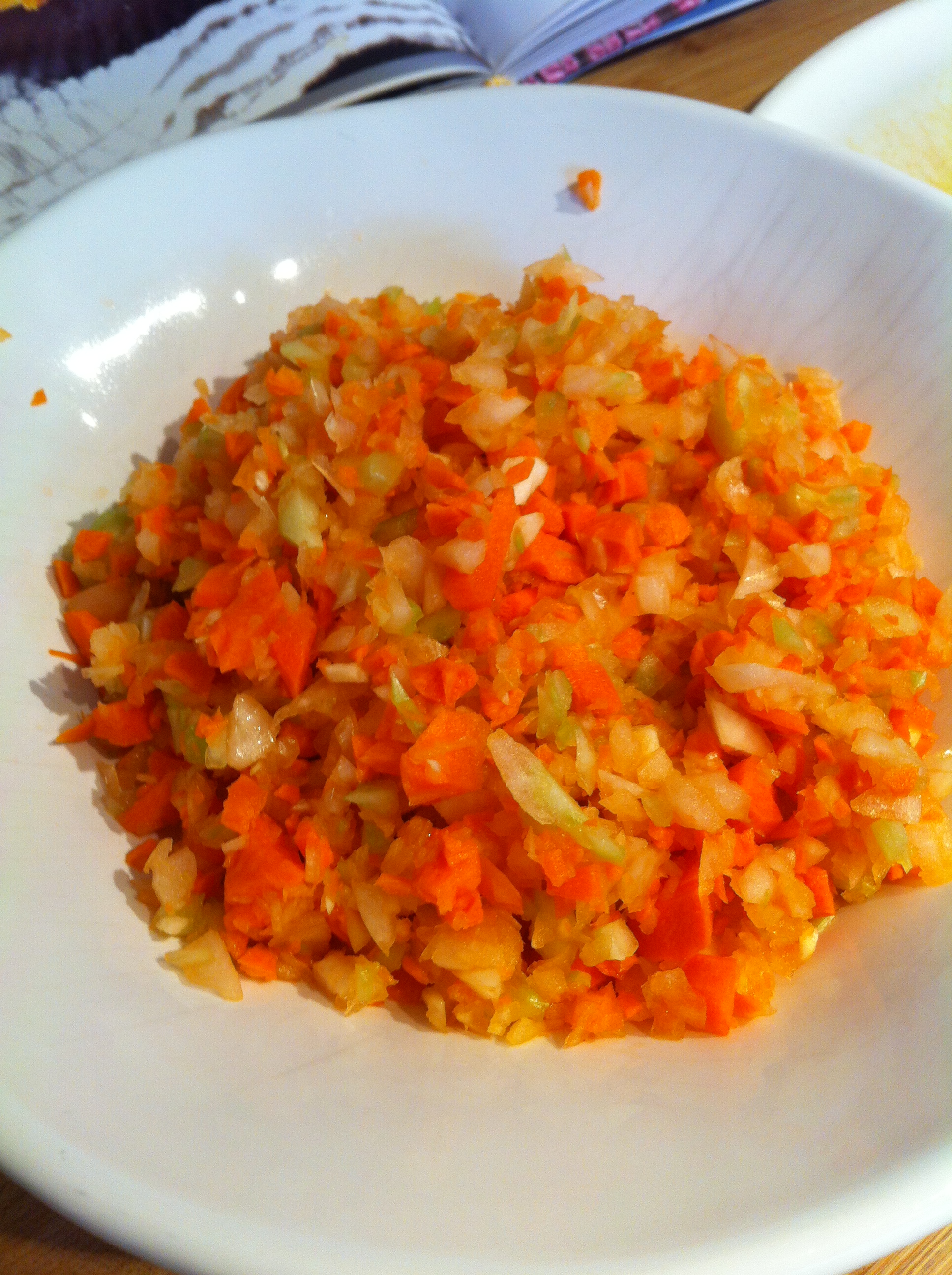 Next, cook your onions, carrot, celery, red pepper flakes, and salt.
