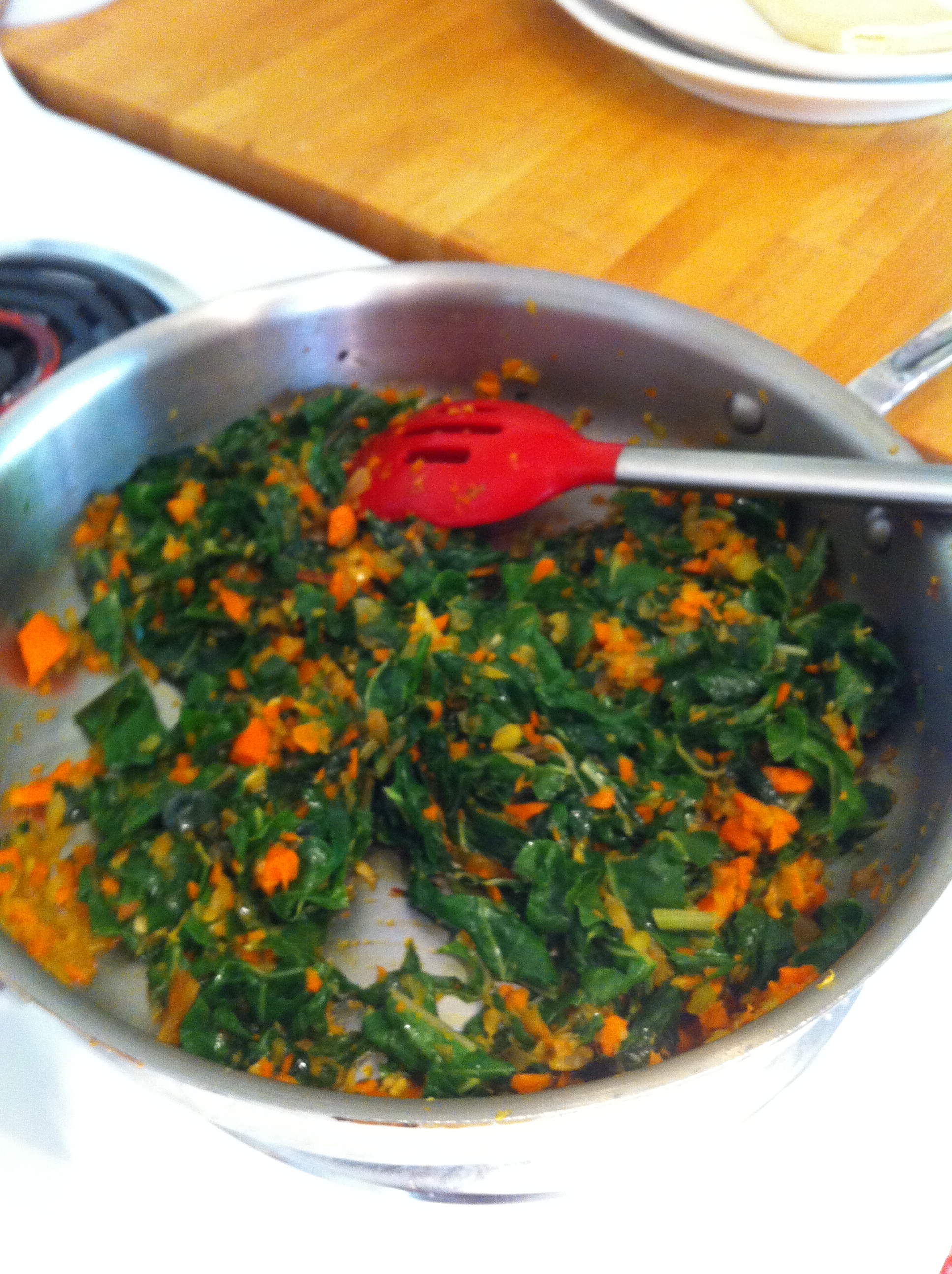 Add your garlic and chard for the last few minutes. Look at this beautiful Swiss chard.