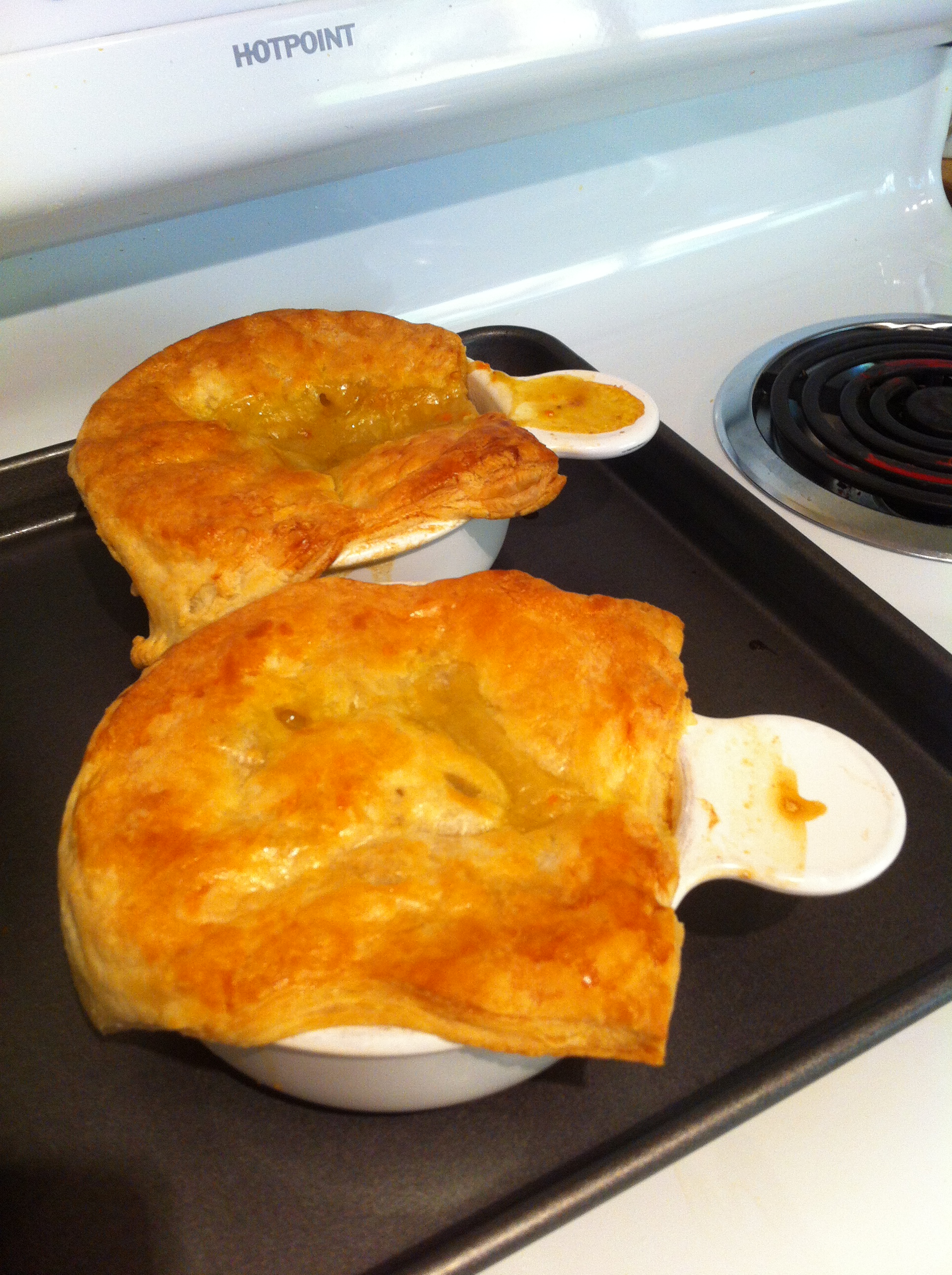 Assemble and cook pot pies. Eeeks! I did not make my own “lids”! Horrible, I know. I used frozen pastry puff (gasp!). A couple of reasons behind that: I am scared to attempt my own dough; and first and foremost, I’m a little bit lazy. I’ll get there someday but for now pastry puff was quick, easy, and still really delicious.